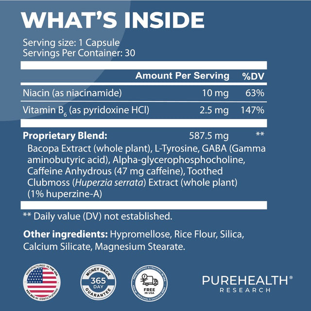Defend against the brain and memory drops associated with aging. Taking a daily nootropics brain support supplement is linked to neurological function and mental clarity. Optimize your ability to learn and concentrate so that you can continue living independently. The Pure Health Ageless Brain memory supplement contains niacin and vitamin B6. Studies show they help improve brain cell survival and promote new synaptic connections. This focus supplement capsules include caffeine, phosphatidylserine, green tea extract, and bacopa aerial. A proprietary blend of herbal extracts designed to help your productivity, clarity, and emotional well-being. Professionally Formulated in the USA — Produced in a GMP-certified facility, these brain supplements for memory and focus are vegetarian and non-GMO. They do not contain soy, gluten, or dairy. Plus, they’re packed with anti-oxidative polyphenols and flavonoids to help improve your circulation.
