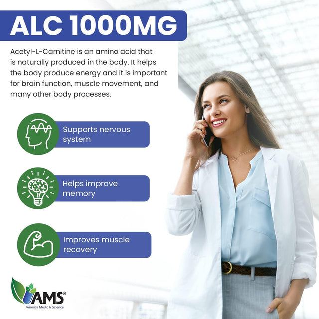 America Medic & Science Acetyl L-Carnitine 1000Mg (60 Tablets) | Dietary Supplement for Men and Women | Promotes Energy Production | Supports Brain Health | Helps Improve Memory and Focus