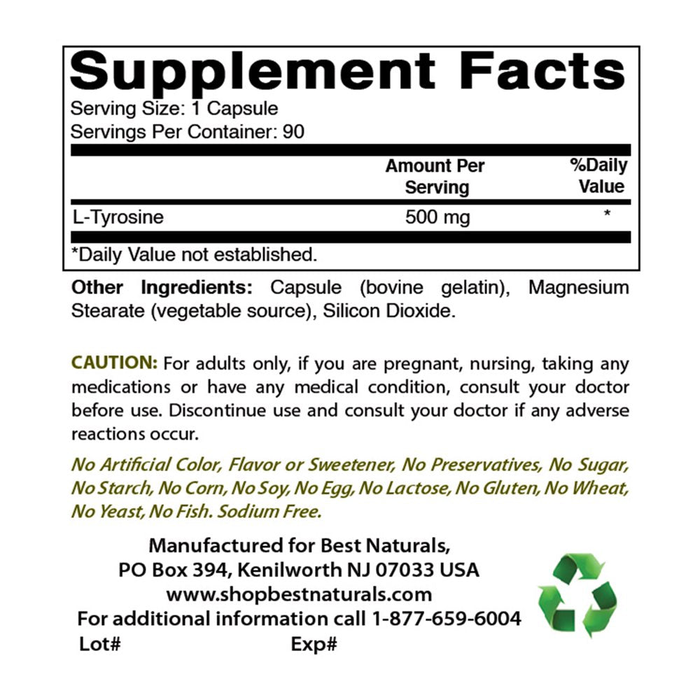 Best Naturals L-Tyrosine 500 Mg 90 Capsules I Helps Support Overall Brain Health | Stress Support and Supports Mental Alertness