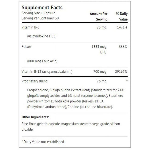 Proprietary blend of pregnenolone, ginkgo biloba extract, eleuthero powder, gotu kola, choline - Traditional memory nutrients that work to keep you sharp.