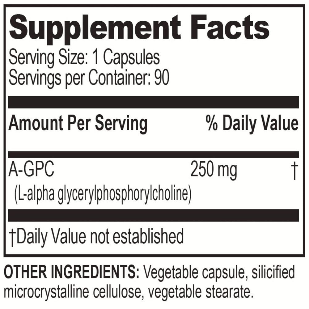 Ultra Alpha GPC is the most bioavailable form of Choline currently on the market. Each single capsule contains 250mg of pure Alpha-GPC giving you the cognitive advantage you will notice. Alpha GPC is used in other countries as first line therapy for cognitive issues such as memory and focus. Alpha GPC is the choice of thousands due to its ability to cross the blood brain barrier and go directly to where it is needed. Ultra Alpha-GPC serves as the critical building block for acetylcholine synthesis. Acetylcholine plays an important role in many cognitive processes including memory, muscle activity, intelligence and mood.