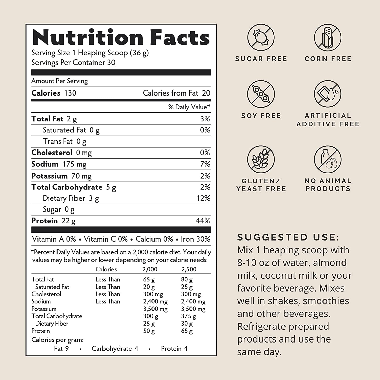 - VEGAN PROTEIN - Each scoop contains 22 grams of protein from a base of pea protein combined with rice protein, quinoa protein, and chia protein. It is also enhanced with key amino acids and glutamine to aid in muscle recovery from exercise.