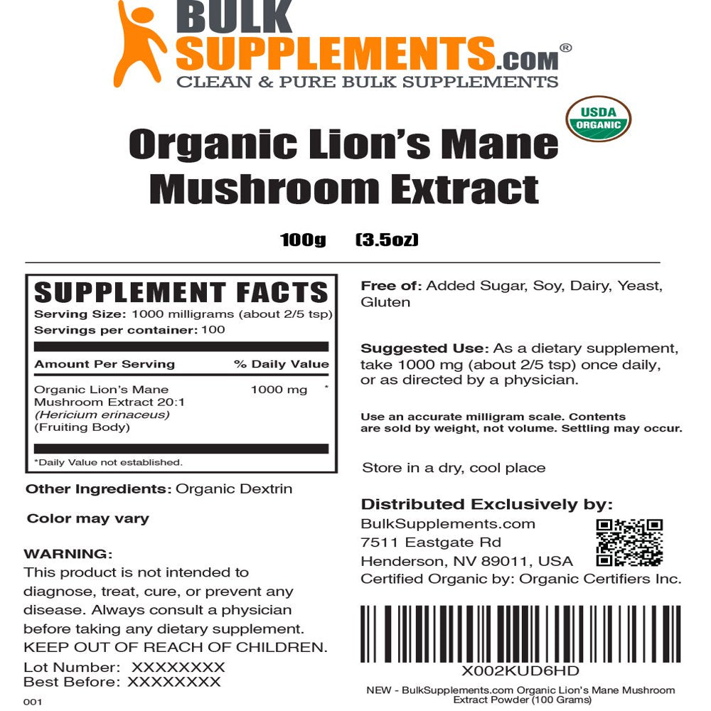 Bulksupplements.Com Lion'S Mane Mushroom Extract Powder, 1000Mg - Memory Boosting Supplement (100G - 100 Servings)