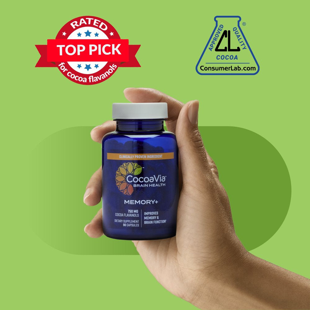 Cocoavia Memory+ Brain Supplement, 30 Day, 750 Mg Cocoa Flavanols, Memory & Brain Booster, Vegan, Plant Based, Gluten Free, 90 Capsules
