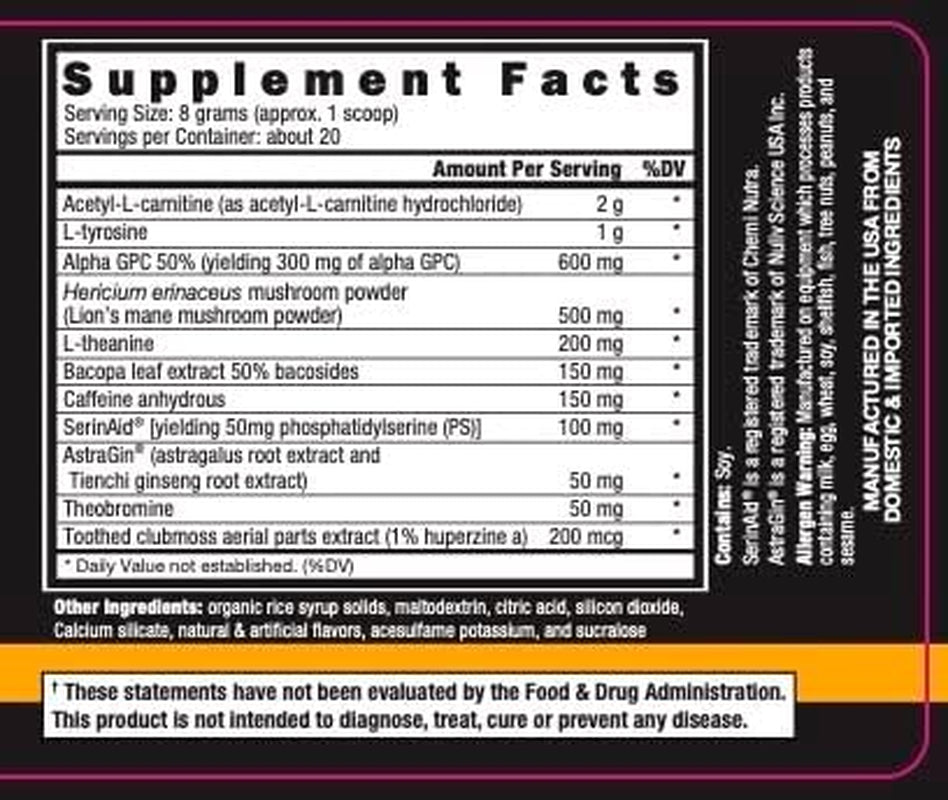 - Insane Ingredients: We included thoroughly researched ingredients like caffeine to deliver the most powerful supplement out there! The included caffeine combined with 600 mg Alpha GPC and Bacopa work to prevent exercise-induced reductions in choline levels, thus increasing endurance performance.