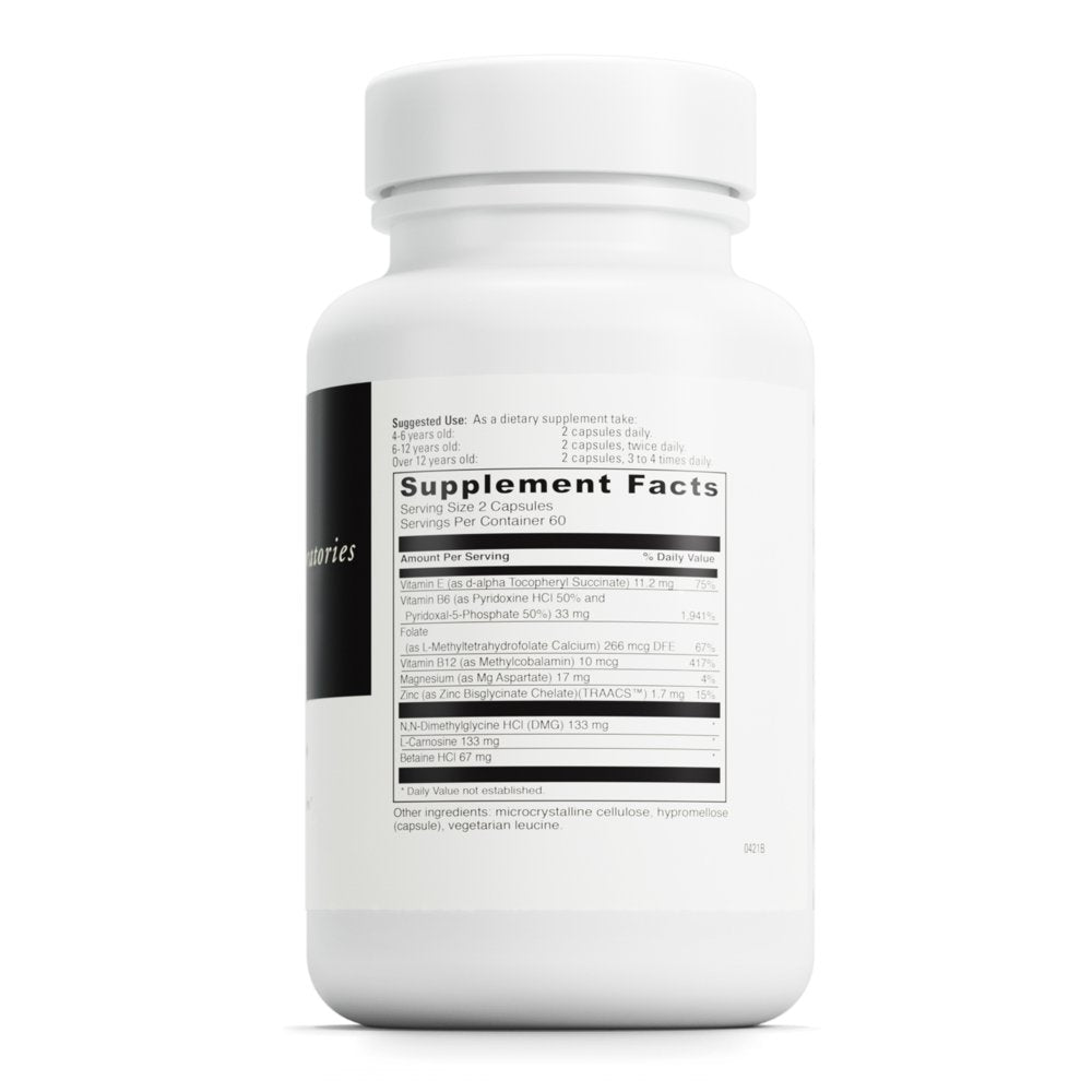 Ingredients: Vitamin E (as d-alpha Tocopheryl Succinate), Vitamin B6 (as Pyridoxine HCl 50% and Pyridoxal-5-Phosphate 50%), Folate (as L-Methyltetrahydrofolate Calcium), Vitamin B12 (as Methylcobalamin), Magnesium (as Mg Aspartate), Zinc (as Zinc Bisglycinate Chelate)(TRAACS), N,N-Dimethylglycine HCl (DMG), L-Carnosine, Betaine HCl