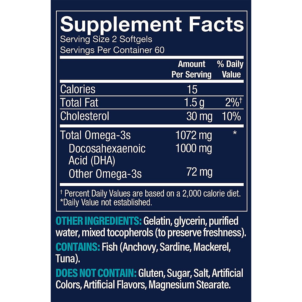 - Each two softgel serving provides: Support for brain health, Support for eye health, 1000mg of docosahexaenoic acid (DHA), Premium omega-3 fatty acids from Friend of the Sea Certified sustainable fisheries, High-quality nutrition without gluten or GMOs