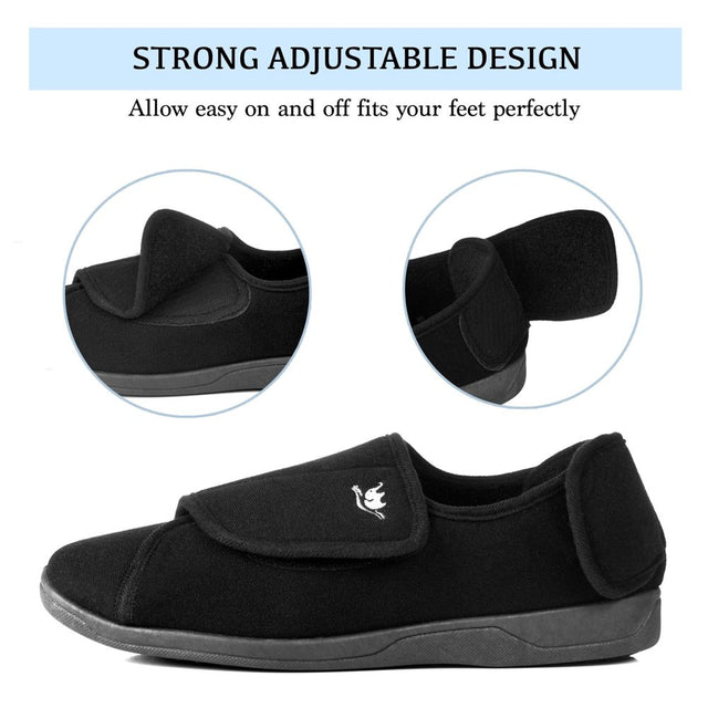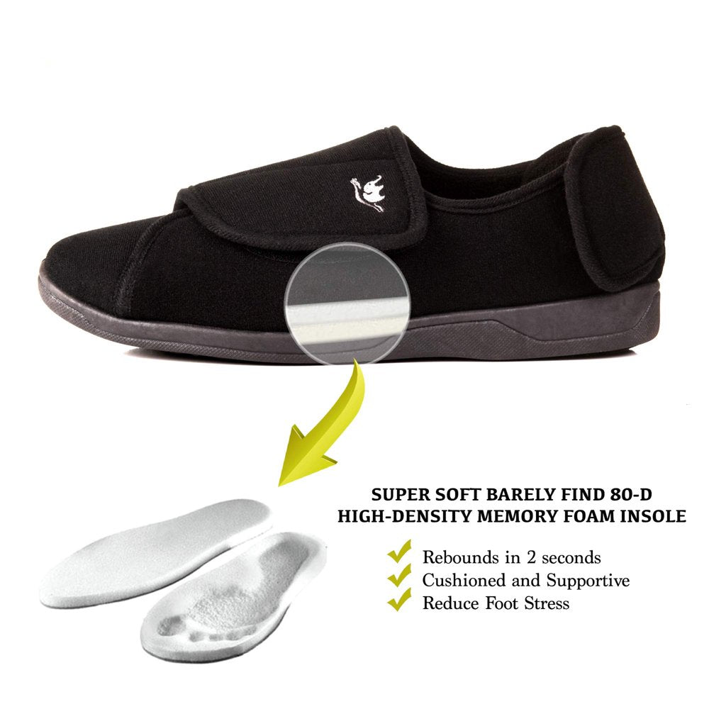 EUROPEAN SOFTEST 80D High Density Memory Foam Diabetic slippers are suitable for indoor, around the house, and general lounging. The hook-and-loop closures easily adjust to help comfort swollen feet. For people suffering from foot edema, diabetes, neuropathy, corns, or other podiatry problems; as well as those who have trouble putting on regular shoes which may hurt sensitive skin. Available in 3 COLORS with 2 TYPES. Black, Blue , Grey Colors are soft Terry cloth upper with cozy fuzzy coral fleece lining and Black/White, Blue/White , Grey/White colors are soft Terry cloth upper with White FAUX SHERPA lining. Both Types are unique hook & loop closure for adjustable comfort perfect for tired, swollen feet and better stability. Easy slip-on, full coverage style with comfortable, adjustable strap for customized fit that hugs your feet.