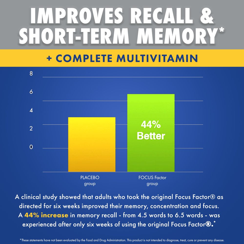 - CLINICALLY TESTED RESULTS: A clinical study showed that adults who took the original Focus Factor as directed for six weeks improved their memory, concentration and focus.