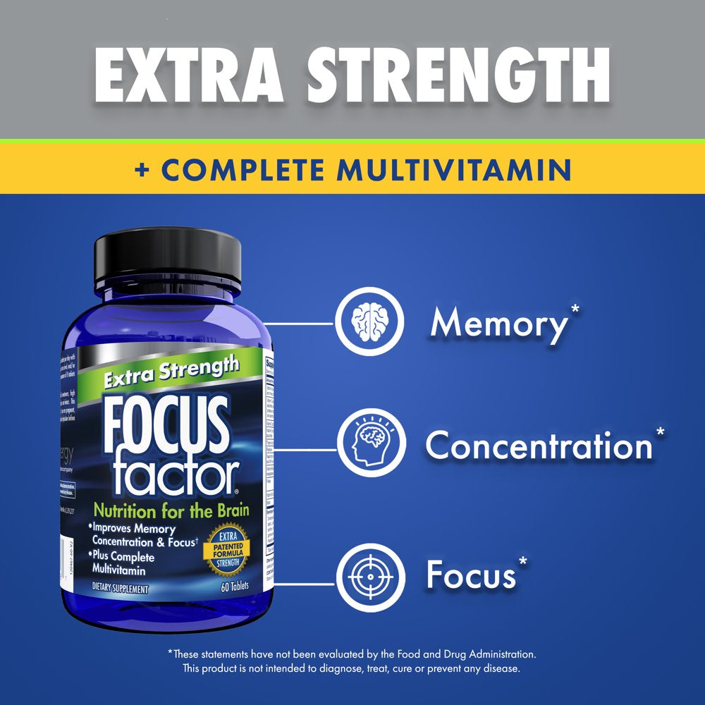 Focus Factor® Extra Strength is an advanced formulation with increased levels of key neuro-nutrients to improve memory, concentration, and focus. It contains a powerful combination of neuro-nutrients plus vitamins and minerals, and even doubles as a complete multivitamin for a 2-in-1 product.* Focus Factor® has been a trusted brain health nutrition brand for nearly 20 years, offering a family of products for adults and children.