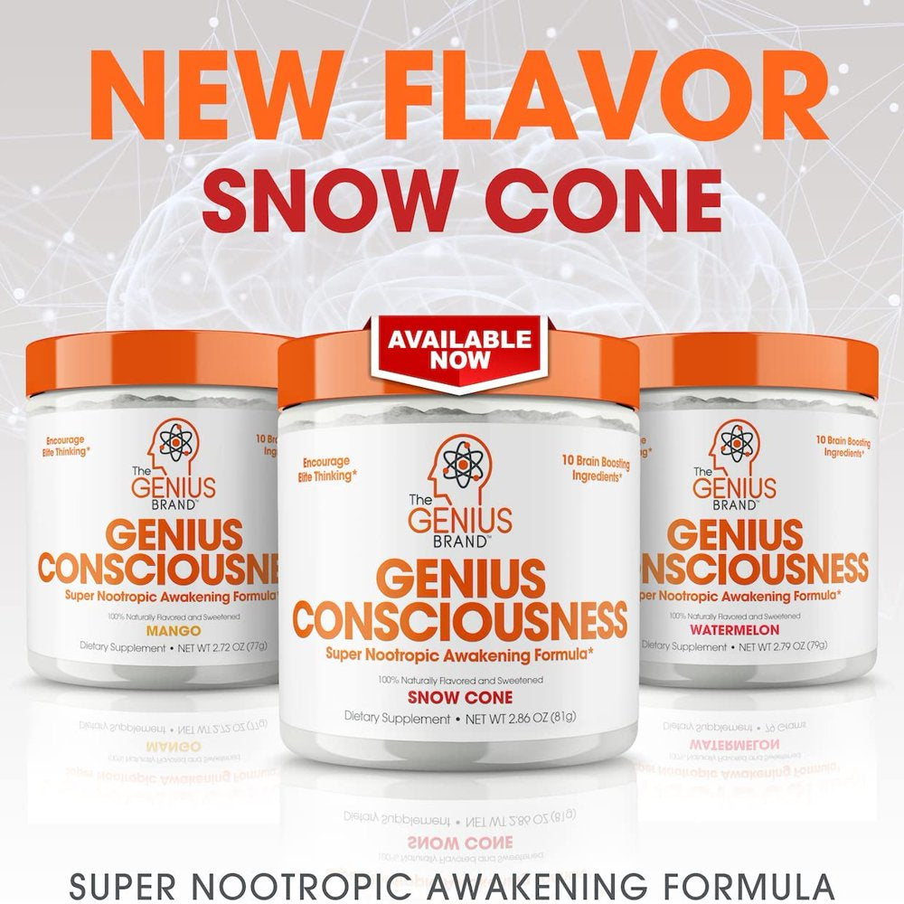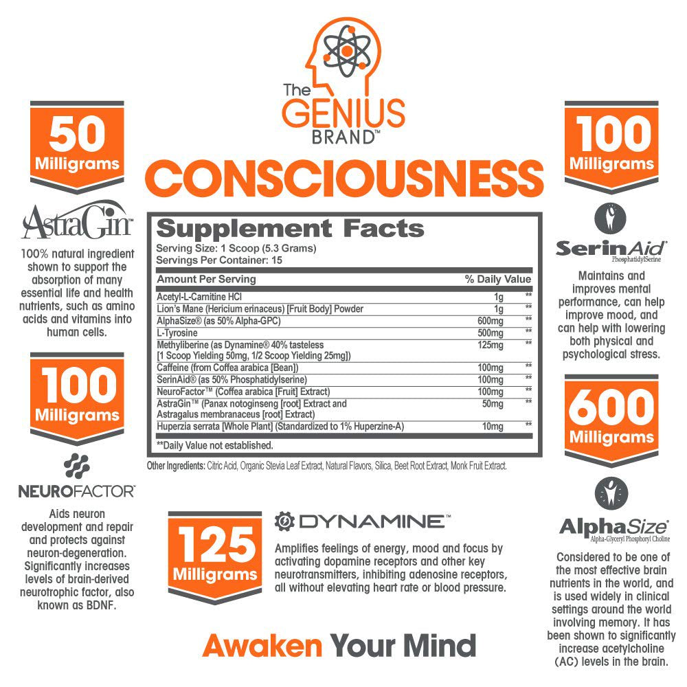 Genius Consciousness is a combination of premium all-natural, brain enhancing ingredients brought together in an all-in-one, great tasting daily drink for high performance thinking. Formulated with researched and trademarked ingredients such as Alpha Size®, SerinAid®, NeuroFactor®, Dynamine® and Lions Mane to help provide mental capacity support in all significant areas of measures in key brain functions, including memory, concentration, learning, recall, mood, and focus. Consider stacking Genius Consciousness with The Genius lions mane mushroom powder memory mushroom nootropic supplement, Genius Mushrooms. Genius Consciousness has redefined the nootropic category by harnessing the power of nature's bounty. Compare with similar items: Prevagen and Force Factor Forebrain. Unlock your own Genius today!
