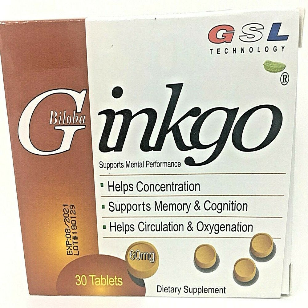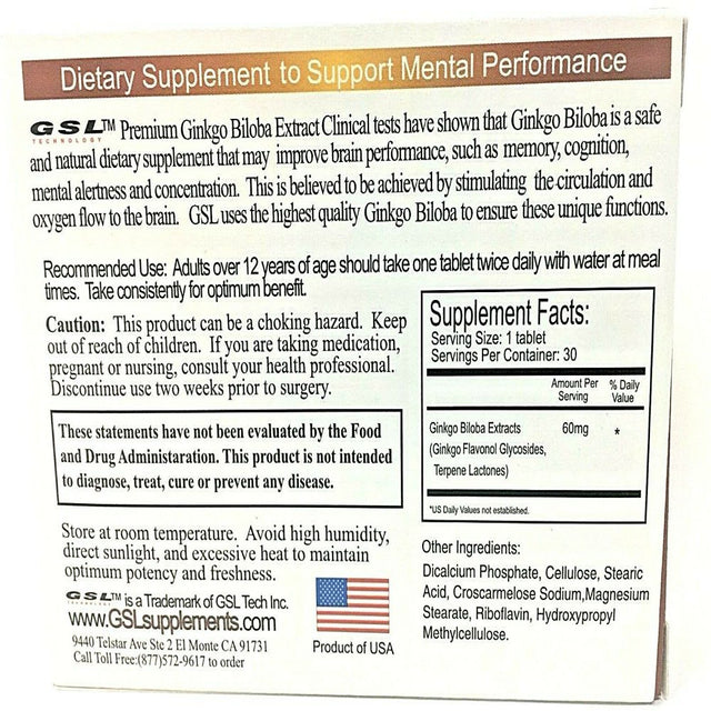 GSL Diet Supplement Ginkgo Biloba 60Mg 30 TB Helps Concentration Support Memory