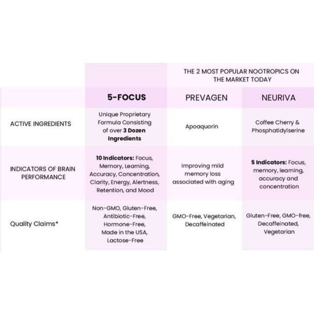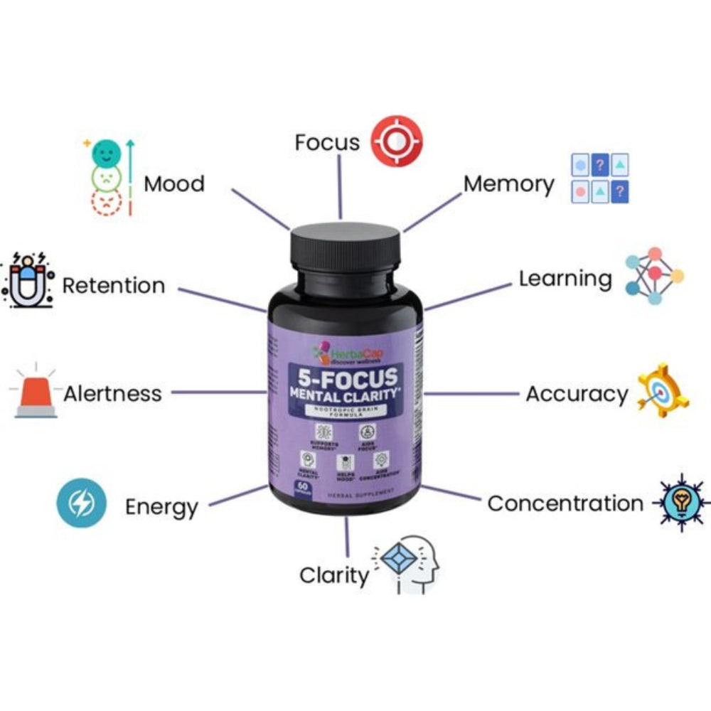 • 100% pure components: These 5-FOCUS Mental Clarity capsules are created with 100 percent high-grade pure components that help the body and promote health and vitality. This superior proprietary blend outperforms any liquid drops, powdered, gel, tea, or chewable form. It is suitable for both men and women equally.