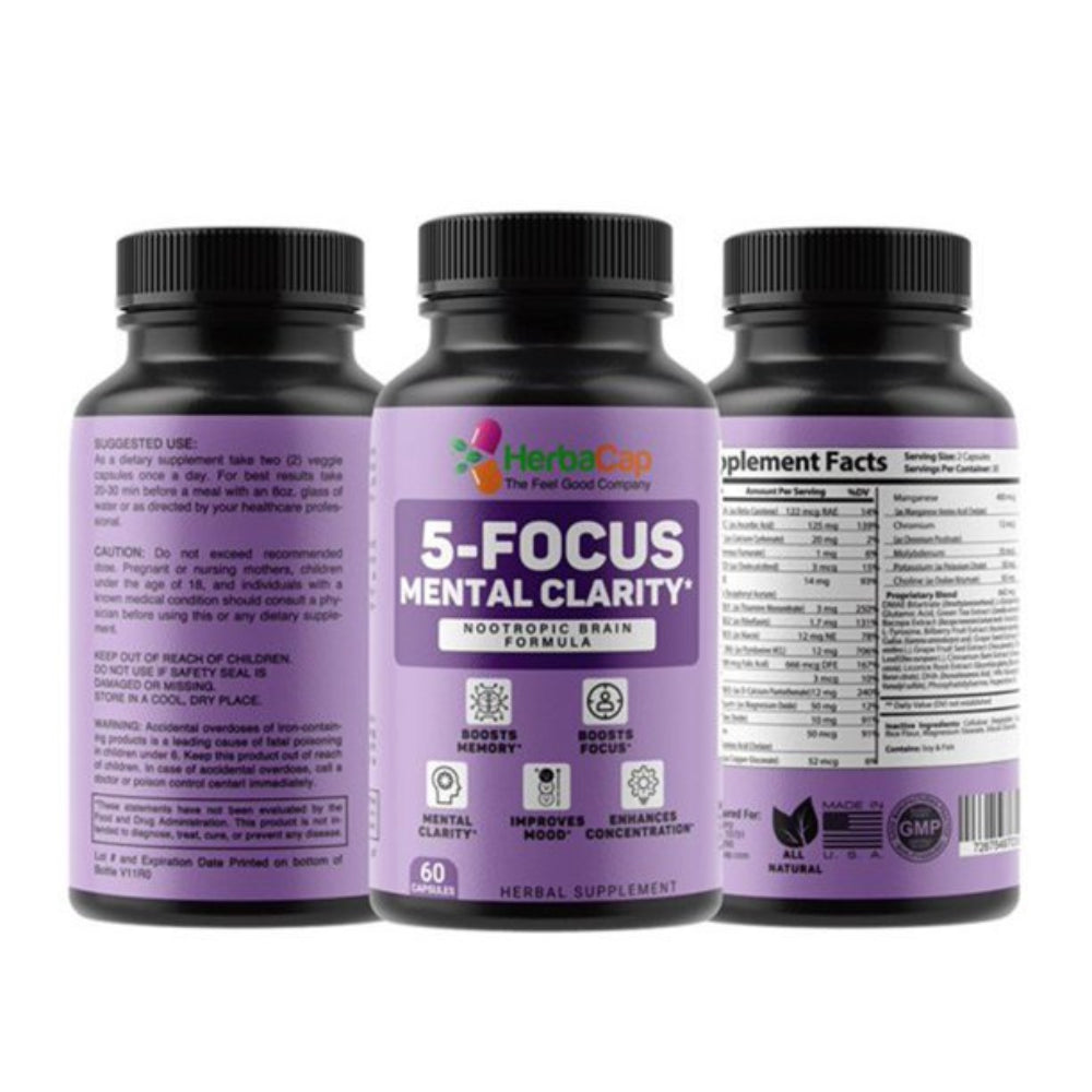 Herbacap 5-Focus Mental Clarity Supplement for All Ages of Men & Women, Multivitamin Supplement for Boost Memory (3 Pack)