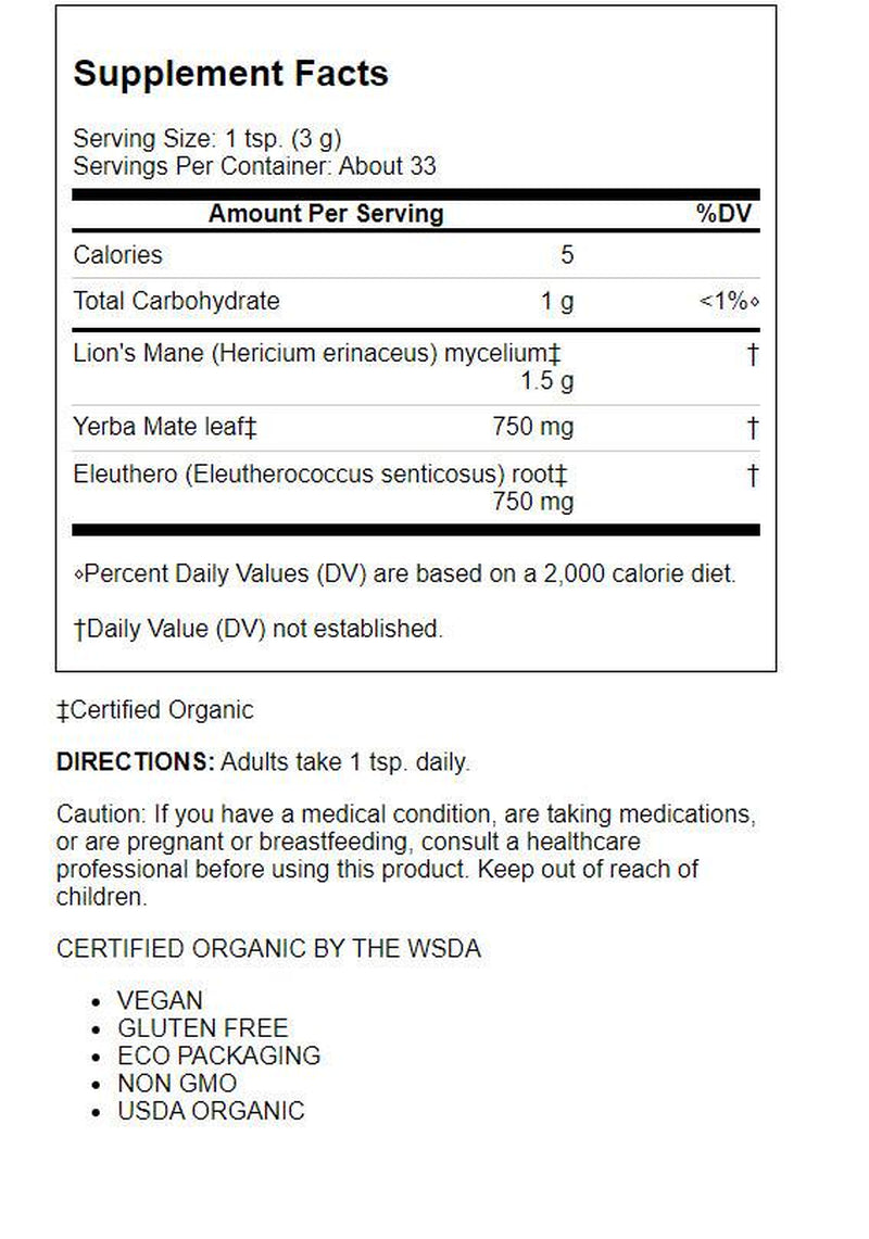 Host Defense MycoBotanicals Brain Energy delivers the combined support of organic herbs and mushrooms for a healthier, more energized brain in every powdered serving. Featuring adaptogenic Lion's Mane, called the "smart mushroom," this formula has been expertly crafted to help your body respond to stress while also supporting your cognitive functions. Every serving of Host Defense MycoBotanicals Brain Energy also features an herbal blend that includes energizing eleuthero and yerba mate. These herbs have traditionally been used not only for their antioxidant support, but also for their ability to help the body boost energy production so you can focus and accomplish your goals without resorting to sugary energy drinks.