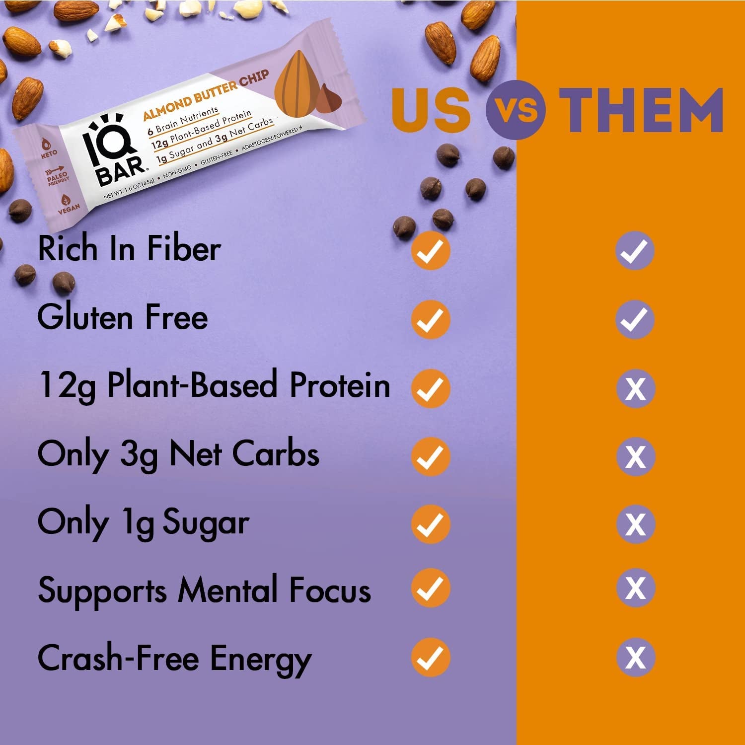 • No. 1 Keto-Friendly Snack Bars for Brain & Body - IQBAR low carb bars are made using simple ingredients + 6 amazing brain nutrients. The keto snack bars are designed to keep you full, focused & energized throughout the day. Our gluten free protein bars also contain 12g plant-based protein, 1-2g sugar, 8-10g fiber & only 3g net carbs. These vegan keto bars are packed with nutrients & healthy fats to support your active & healthy lifestyle