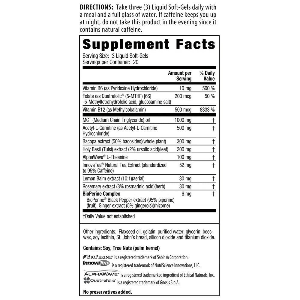 Ingredients: Vitamin B6, Folate, Vitamin B12, MCT oil, Acetyl-L-Carnitine, Bacopa extract, Holy Basil extract, AlphaWave L-Theanine, InnovaTea Natural Tea Extract, Lemon Balm extract, Rosemary extract, BioPerine Complex; gelatin, flaxseed oil, purified water, glycerin, beeswax, soy lecithin, St. John’s bread (carob) (color), maltodextrin, titanium dioxide (color), silicon dioxide, dicalcium phosphate and mannitol.