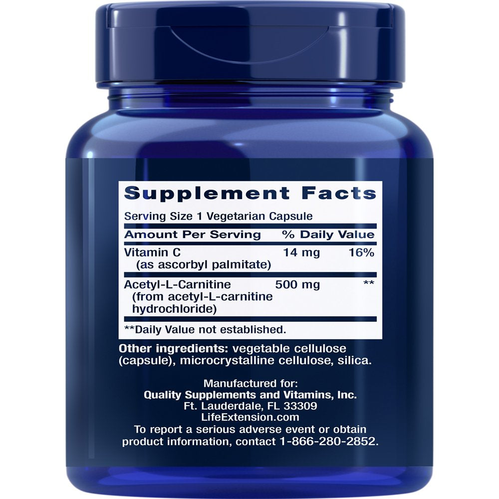 Life Extension Acetyl-L-Carnitine, Acetyl-L-Carnitine, Vitamin C, Brain, Mood & Nerve Health, Cellular Energy, 3-Month Supply, Gluten-Free, Non-Gmo, Vegetarian, 100 Capsules