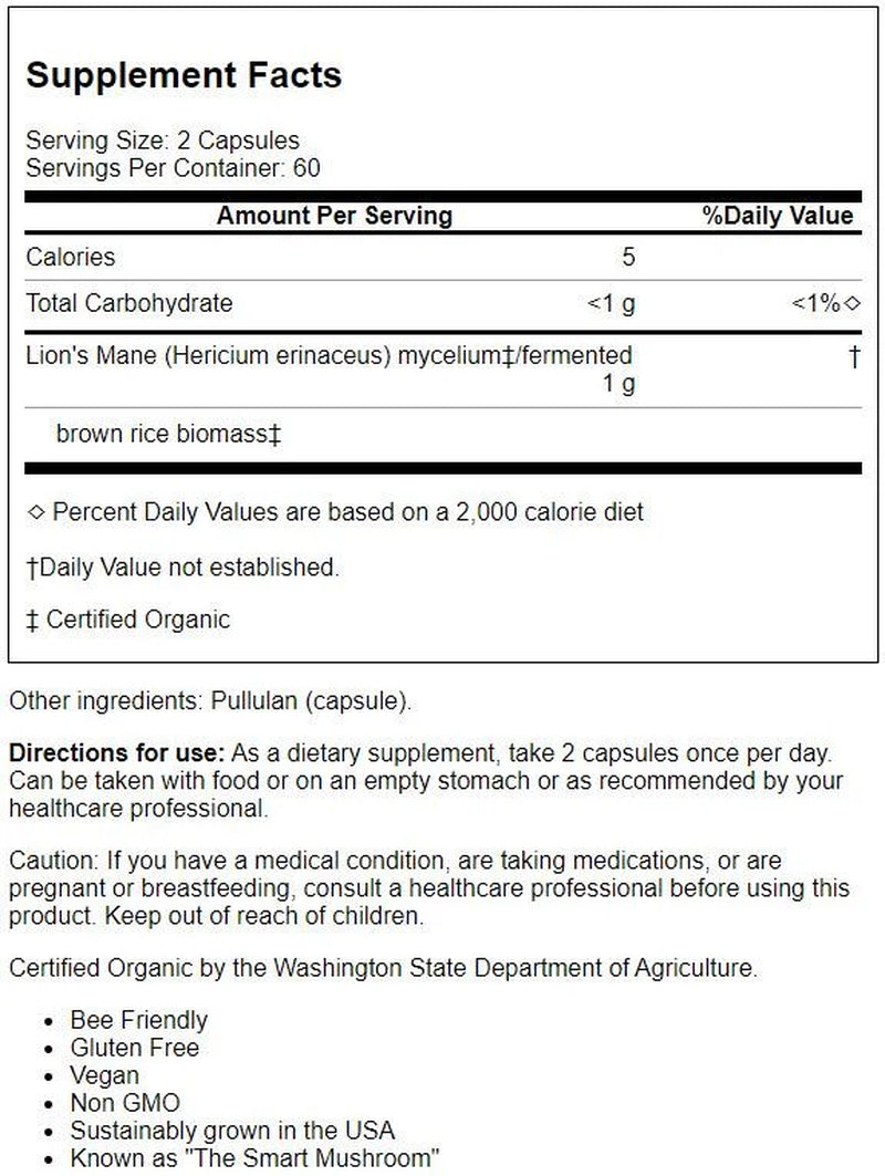 Lion'S Mane - Memory & Nerve Support with Organic Mushrooms (120 Vegetarian Capsules) - 120 is backordered and will ship as soon as it is back in stock.