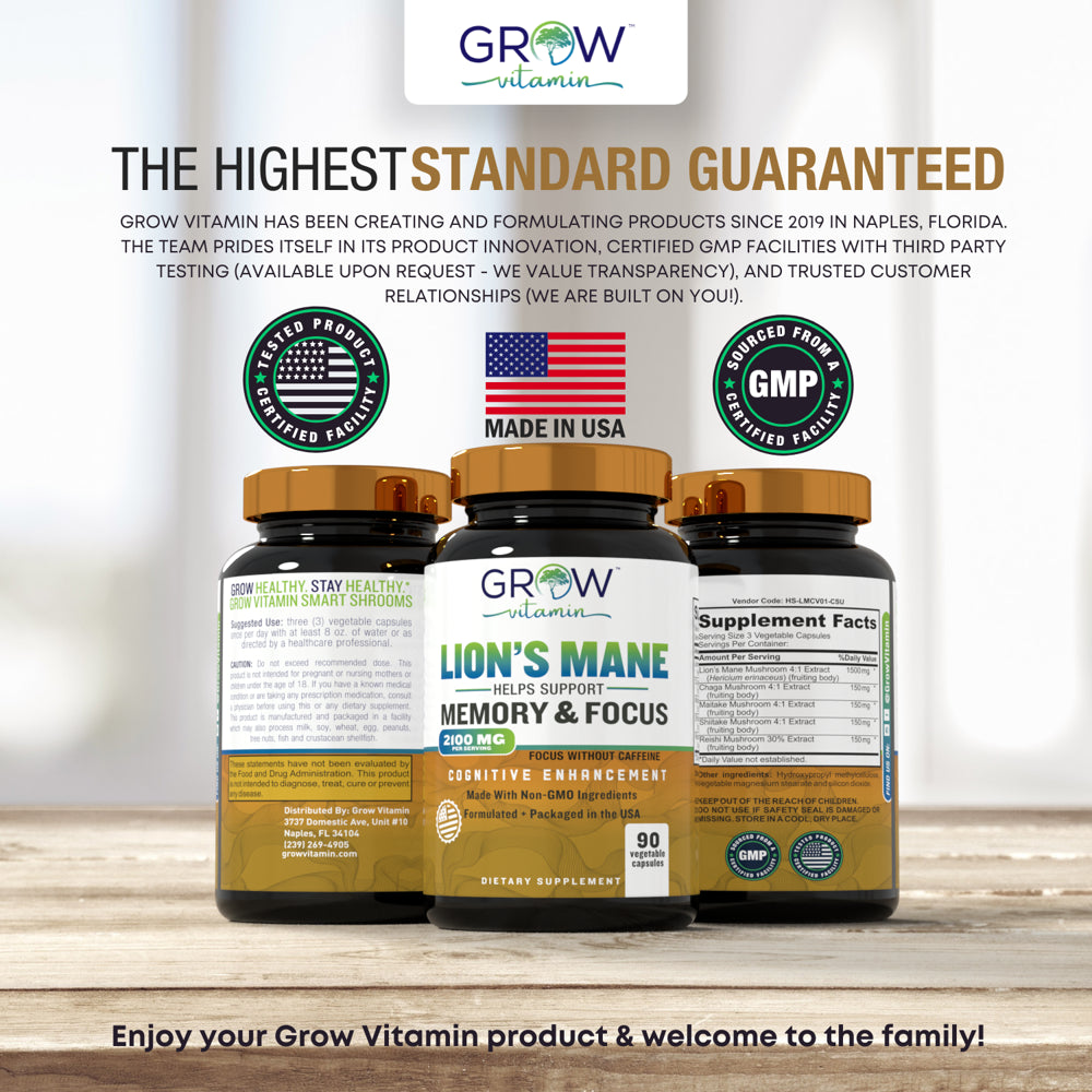 Grow Vitamin Lion's Mane Smart Shrooms contain 2100 mg of High Quality lion's mane that is 100% grown and manufactured in the USA.