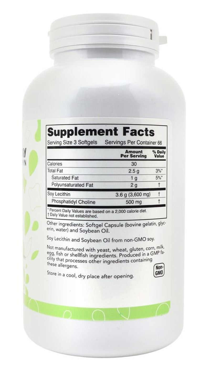 LuckyVitamin - Lecithin Brain & Nerve Support 1200 mg. - 200 Softgels Supplement Facts Serving Size 3 Softgels Servings Per Container 66 Amount Per Serving % Daily Value Calories 30 Total Fat 2.5 g 3%* Saturated Fat 1 g 5%* Polyunsaturated Fat 2 g † Soy Lecithin 3.6 g (3,600 mg) † Phosphatidyl Choline 500 mg † * Percent Daily Values are based on a 2,000 calorie diet.† Daily Value not established. Other Ingredients: Softgel Capsule (bovine gelatin, glycerin, water) and Soybean Oil.Not manufactured with yeast, wheat, gluten, corn, milk, egg, fish or shellfish ingredients. Produced in a GMP facility that processes other ingredients containing these allergens./div>