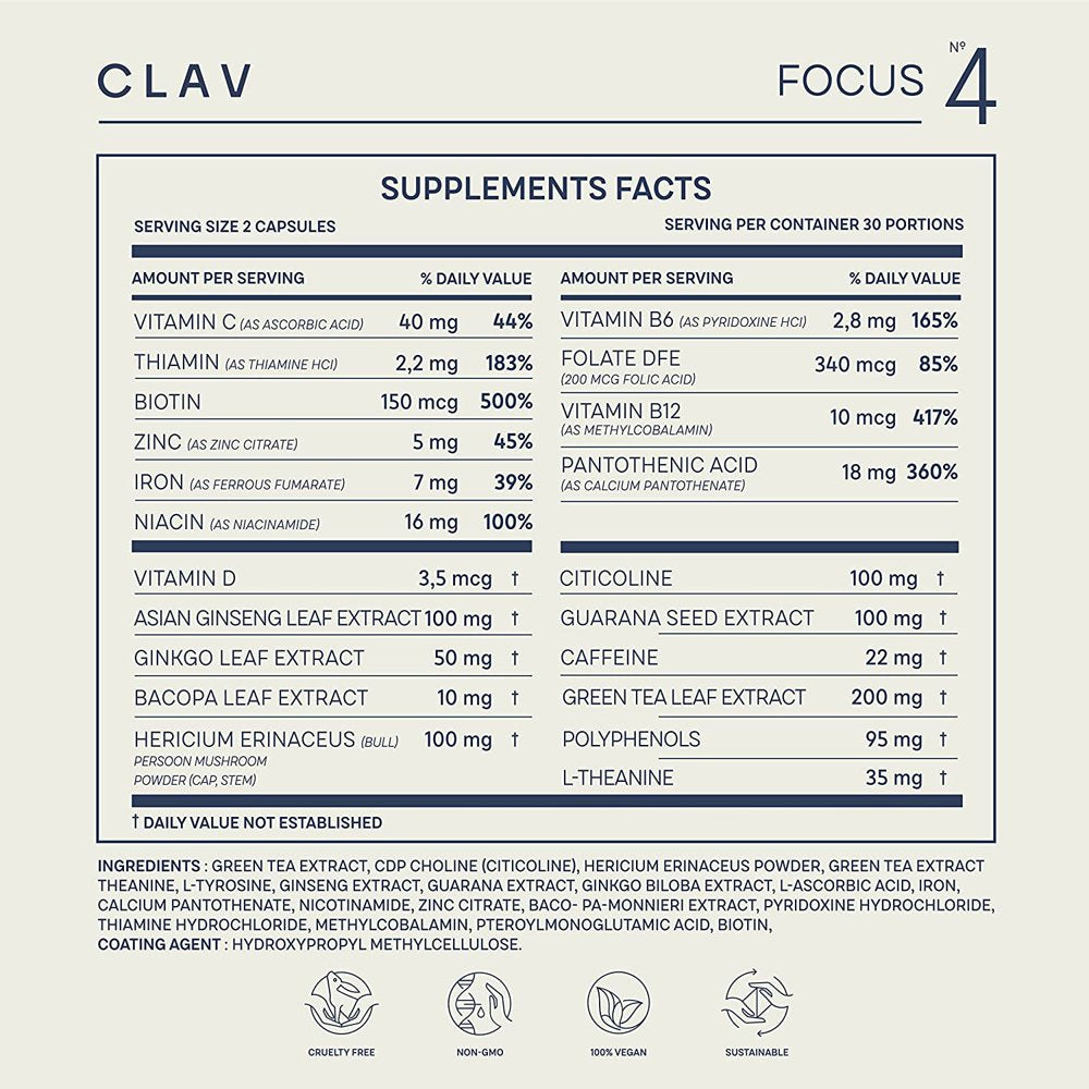 The combination of ingredients in CLAV Focus supports your attention, concenPerformance and concentration