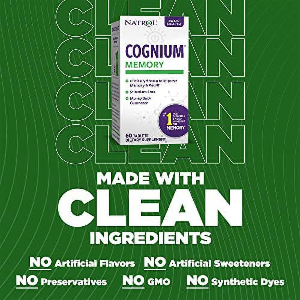 Natrol Cognium Memory is powered by a clinically shown ingredient to improve memory; Natrol Cognium keeps your memory strong. Clean Ingredients: Free of artificial flavors and synthetic dyes; Cognium Memory is 100% Drug-Free, non-GMO, and stimulant free. Better Memory: Cognium acts like an antioxidant for the brain, shielding it from oxidative stress as suggested in an in vitro study in healthy adults. Benefits: Clinical studies have shown statistically significant improvements in memory and recall in healthy adults, in 4 weeks or less when taken as directed. Natrol is one of the leading U.S. dietary supplement brands helping people around the world to support brain health.