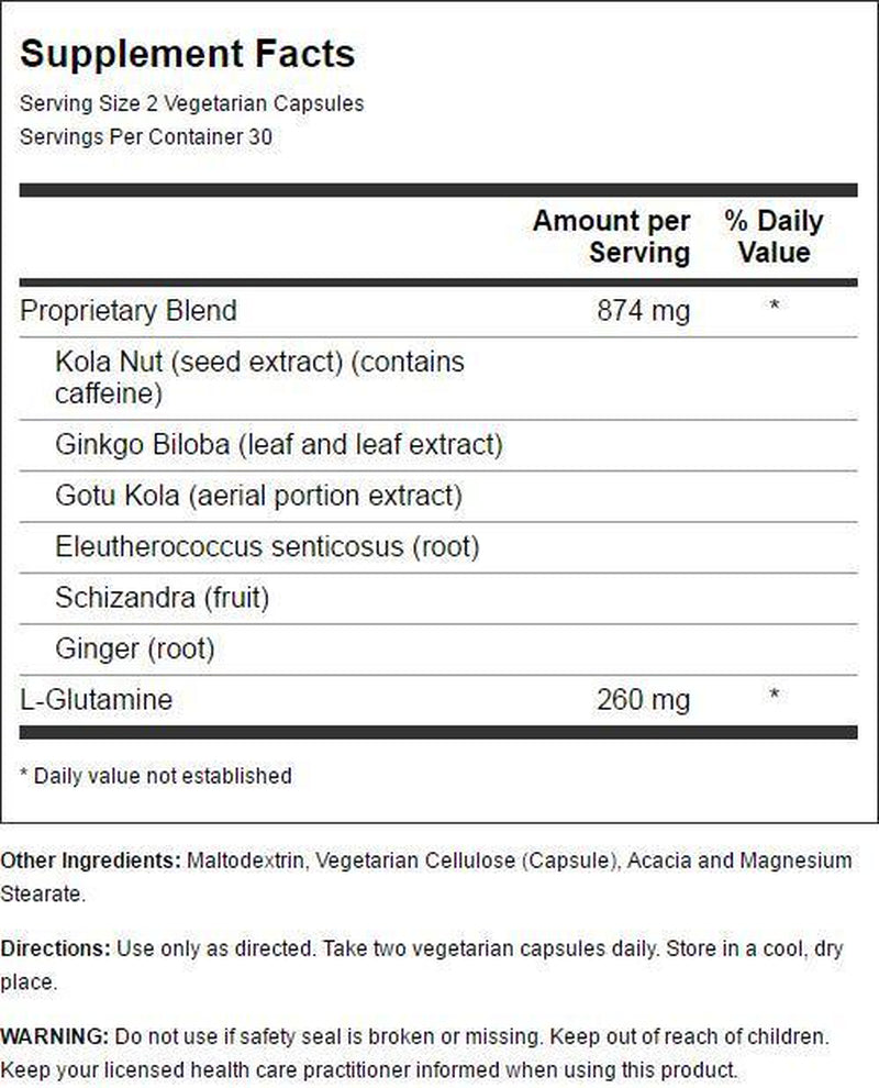 Kola Nut (seed extract) (contains caffeine), Ginkgo Biloba (leaf and leaf extract), Gotu Kola (aerial portion extract), Eleutherococcu senticosus (root), Schizandra (fruit), Ginger (root) L-Glutamine/div>