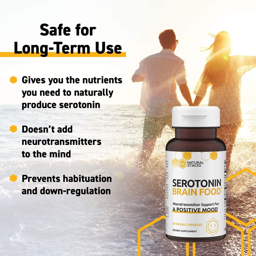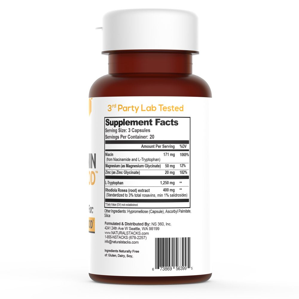 Natural Serotonin Support for a Positive Mood: Natural Stacks Serotonin Brain Food features Vitamin B3 (Niacinamide and L-Tryptophan), Magnesium Glycinate, Zinc Glycinate, and Rhodiola Rosea Extract - a natural blend to promote safe serotonin production in the brain.