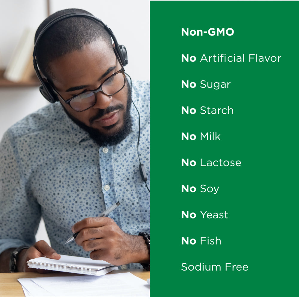 - Includes L-Theanine, an amino acid found in green tea, to help calm the mind and support focus*