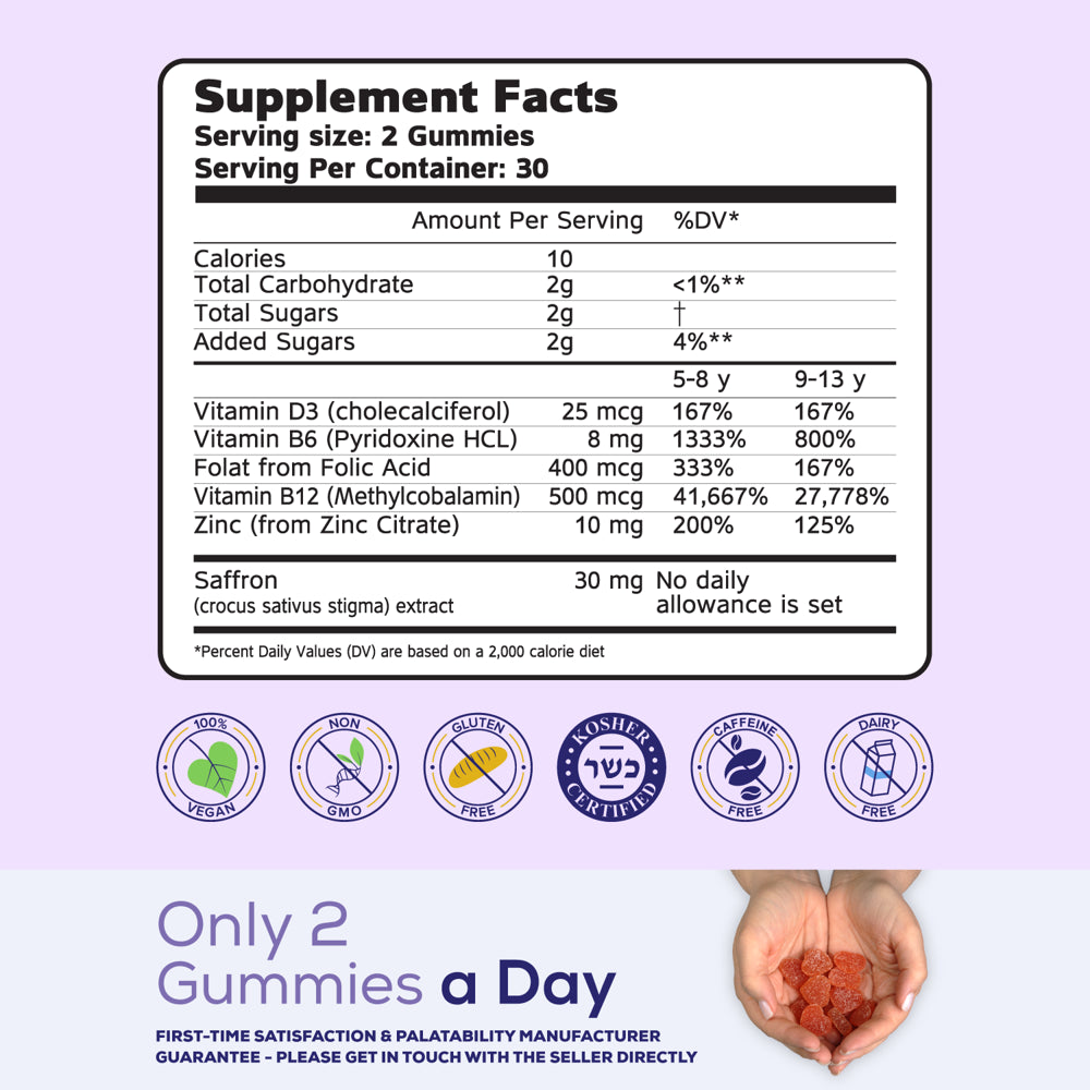 FORTIFIED WITH VITAMINS & MINERALS:In addition to the Saffron Herb, these premium gummy vitamins for kids also incorporate Sunshine Vitamin D3 and Neuro-Enhancing B-Complex including B6, B9 & B12, plus Essential Mineral Zinc for Optimal Immune and Metabolic functions.