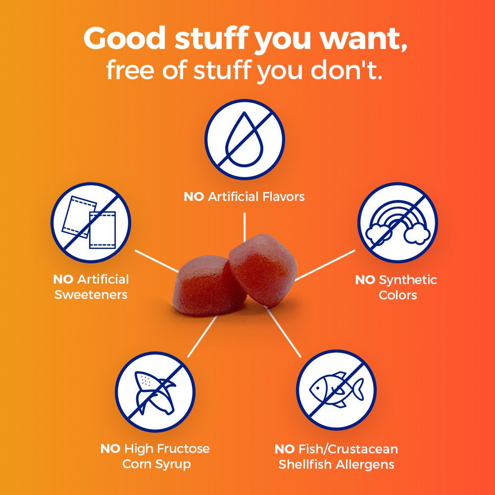 - Free of high fructose corn syrup, artificial sweeteners, synthetic colors and fish/crustacean shellfish, dairy (milk), and egg allergens