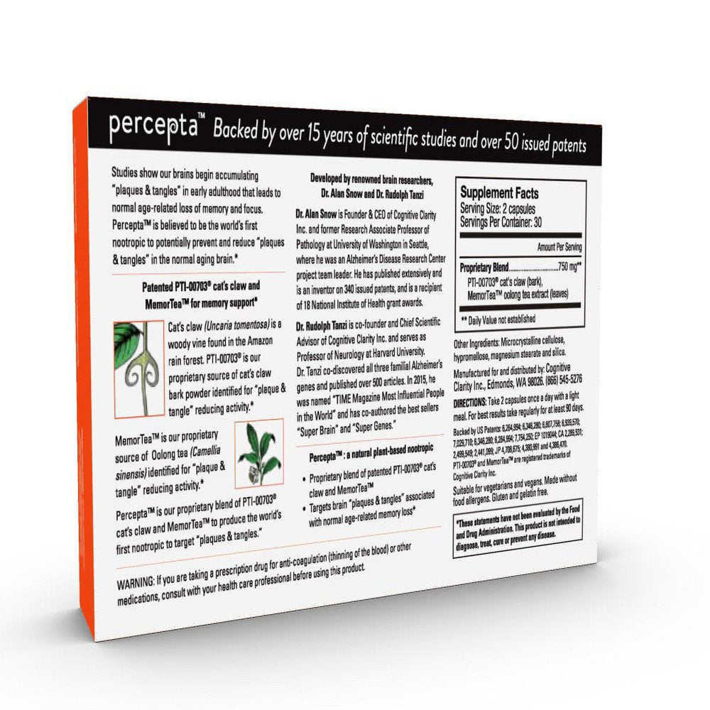 Percepta® is the world's first nootropic to target the real reason we lose memory as we age -brain plaques and tangles. Percepta® contains patented PTI-00703® cat's claw from the Amazon rainforest and a specific exclusive oolong tea extract (called MemorTea®) from the mountains of Asia. PTI-00703® cat's claw is unique to Percepta® to help improve memory, focus and concentration. Percepta® contains the most effective cat's claw ingredient in the world (by 35-90%) that has been scientifically tested for inhibition and reduction of brain plaques & tangles in the normal aging brain - the real reason we lose memory as we age. Developed by two of the world's most renowned brain aging/memory loss researchers: Dr. Alan Snow (CEO, Cognitive Clarity Inc; formerly with University of Washington) & Dr. Rudy Tanzi (Harvard University/MGH). Dr. Snow is a recipient of 18 National Institute of Health grant awards and an inventor on over 350 issued patents pertaining to novel drugs, nutraceuticals and screening technologies. Percepta® is backed by over 15 years of scientific studies, including two major papers published in Nature - Scientific Reports in 2019 (a 108-page paper that won the award for the "Top 100 Most Downloaded Research Articles in 2019 in a Nature Journal), and 2021. Percepta® is also backed by numerous issued patents in the USA and internationally, including a composition of matter patent issued in the USA in 2022 (US Patent #11,376,300 B2; Issued July 5, 2022). A 2021 paper in Nature - Scientific Reports demonstrated that Percepta® outperformed all 20 top-selling memory-support dietary supplements by >50% in reducing brain plaques and tangles (as shown by in vitro screening on a comparative basis). PTI-00703 cat's claw (a proprietary source and extraction method to obtain superior cat's claw) in the 2021 paper also was >35-90% more superior in reducing plaques and tangles, than 17 other commercial manufacturers of cat's claw. PTI-00703® cat's claw is the superior choice of cat's claw for memory support and is only available in Percepta® products.