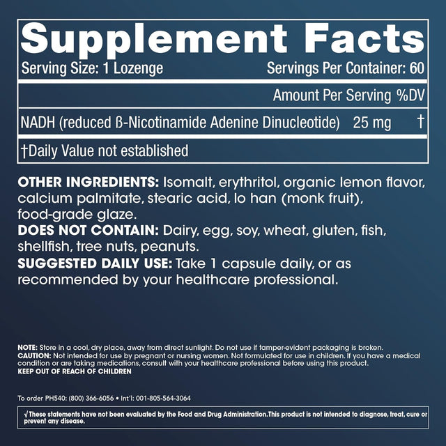 Prohealth NADH Pro - NAD Booster (25 Mg, 60 Fast-Acting Lozenges) Boost Energy, Memory and Focus | Mood Support | Antioxidant | ATP Production is backordered and will ship as soon as it is back in stock.