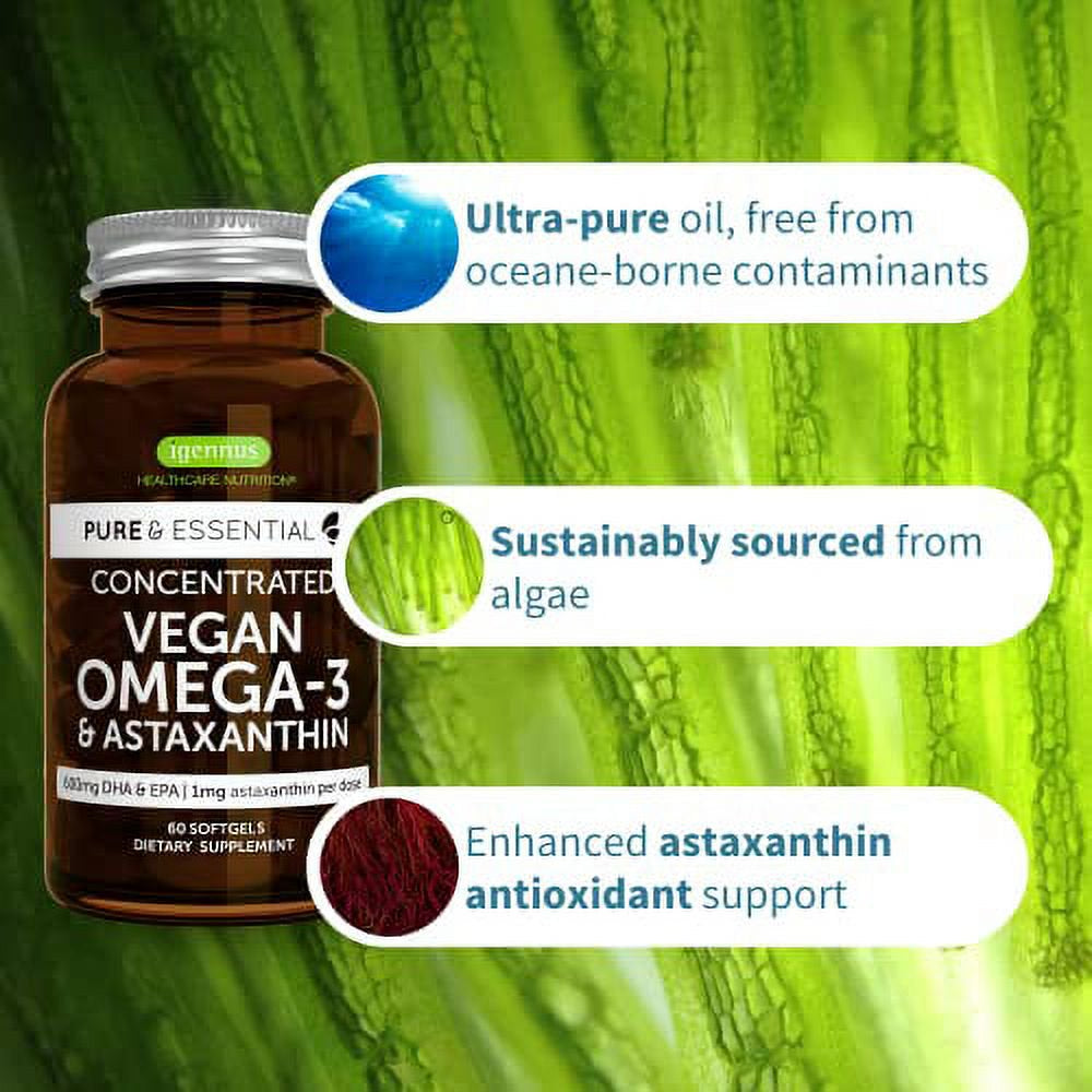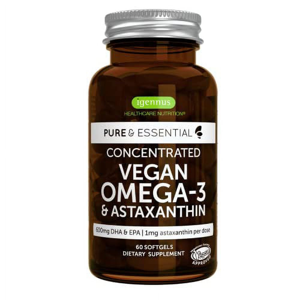 Pure & Essential Vegan Omega 3, High Concentration EPA DHA Algae Oil, Sustainable & Pure, plus Astaxanthin, 600Mg DHA & EPA for Heart, Brain & Eye Health, 60 Small Softgels