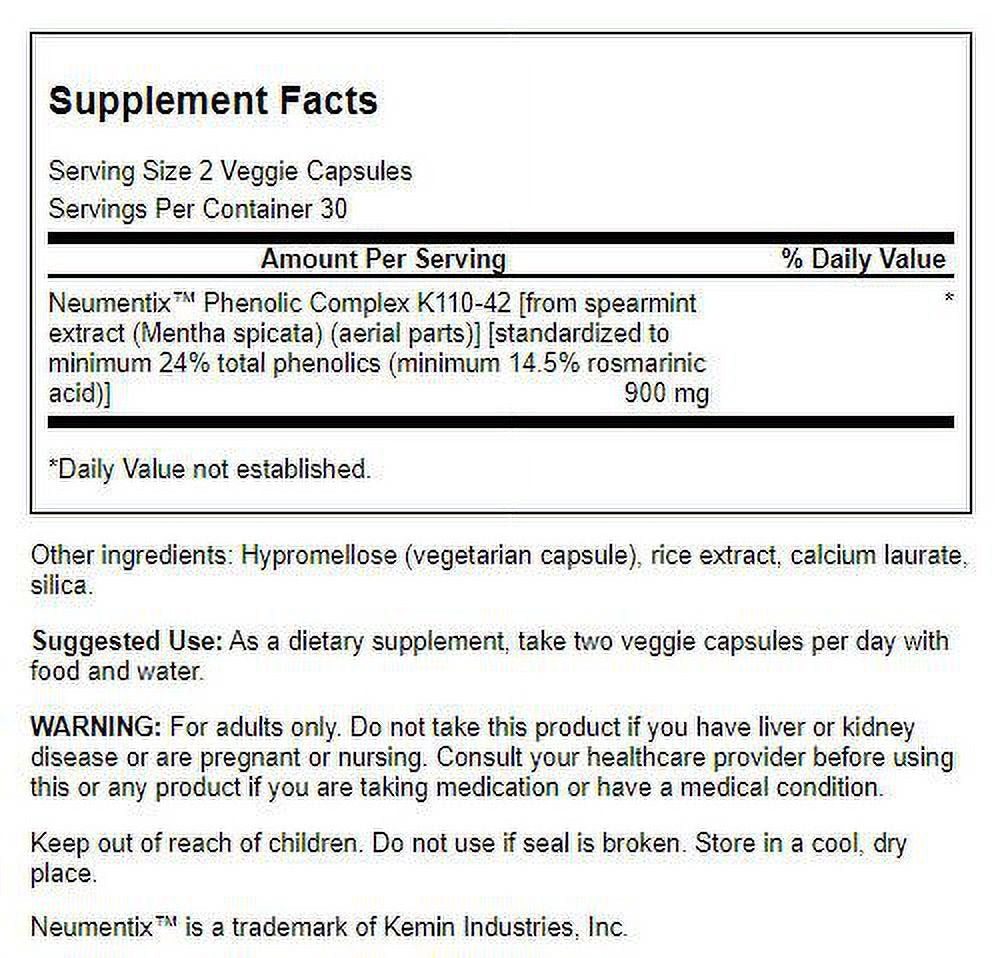 Revitalize your mind to sharpen your memory and cognitive performance with the herbal energizing power of Swanson Nootropic Brain Food. It features a major breakthrough in cognitive support called Neumentix(TM), a spearmint phenolic complex that has been shown to help improve sleep , enhance working memory and boost cognitive performance in adults. Neumentix is a naturally sourced nootropic derived from select lines of non-GMO spearmint and carefully formulated to deliver standardized levels of total phenolics and rosmarinic acid, the constituents believed to be most beneficial for cognitive support . It has been clinically studied to support working memory, promote more productive days without disrupting sleep, stay focused and support mental agility and performance. Swanson Nootropic Brain Food featuring Neumentix gives you safe, reliable support with purity and potency you can count on every time.