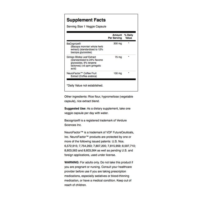 - Features Ginkgo biloba, BaCognize® Bacopa monnieri and NeuroFactor® coffee fruit extract