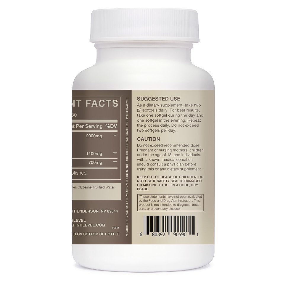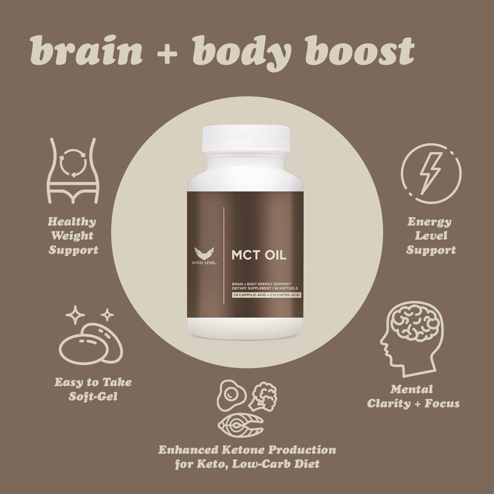 Attention all life-hackers, ketogenic warriors, and cognitive thrill-seekers! Introducing High Level MCT Oil Softgels, supercharged with C8 Caprylic Acid and C10 Capric Acid. Our MCT Oil Softgels are like high-octane fuel for your metabolism. Is that a Keto diet? No, that's the "Ket-Oh Heck Yeah!" lifestyle. This isn't your average MCT Oil. We've got the golden ratio of C8 Caprylic Acid to C10 Capric Acid, perfectly balanced for your benefit. Think of it as the ultimate blend of brain and body fuel, brewed just for you. Our softgels are a blend of C8 and C10, sourced from 100% coconut oil, and carefully designed to provide an easy, convenient way to fuel your day. And you can feel good about choosing a product that says 'no' to palm oil, helping to protect our planet's precious resources. Imagine starting your day without the drag of brain fog, and waving goodbye to that dreaded mid-afternoon slump. With our carefully formulated MCT Oil Softgels, your days will be marked by improved mental clarity and consistent energy levels. They're the secret weapon you need to conquer everything on your to-do list. Whether you're juggling a busy work schedule, crushing it at the gym, or just trying to keep up with the speed of life, these MCT Oil Softgels are the ally you need. They're designed for the driven go-getter in you, providing the support you need to power through and excel. Don't just take our word for it though, click 'Add to Cart' and discover the difference for yourself. Boost your metabolism, enhance your brain function, and give your body the quality fuel it needs with High Level MCT Oil Softgels. Welcome to the next level of wellness and performance.