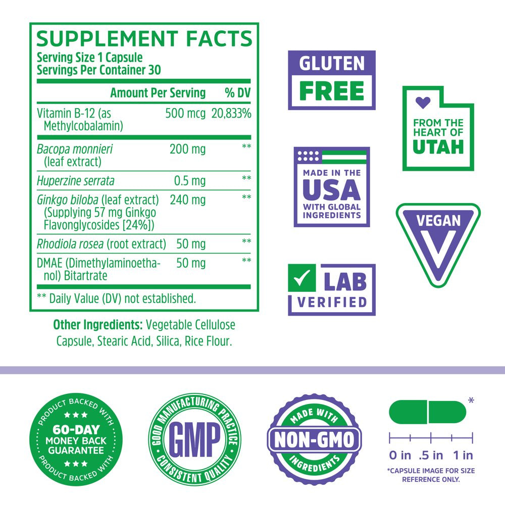 Vitamin B-12 (as Cyanocobalamin), Bacopa Monnieri Extract (whole plant), Phosphatidylserine (20%), Ginkgo Biloba (24% Ginkgo Flavone Glycosides) (leaf), Rhodiola Rosea Extract (Salidroside 3% Rosavins 1%) (root), DMAE (Dimethylaminoethanol Bitartrate), Other Ingredients: Gelatin (capsule), Rice FLour, Vegetable Magnesium Stearate, Silica/div>