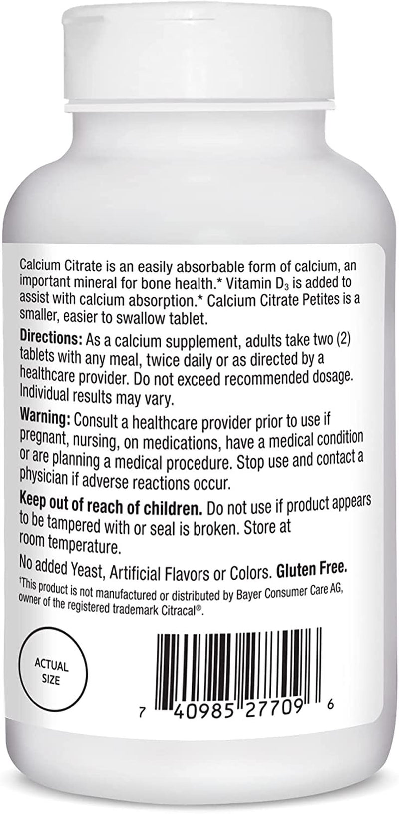 Pack of 3 for the UPC: 740985277096Calcium Citrate is a highly absorbable form of Calcium, an important mineral for supporting bone health. Calcium also works to support muscle and nerve function. Vitamin D3 is added to assist with Calcium absorption and as support for healthy immune function. No added Sugar, Yeast, Preservatives, Artificial Flavors or Colors. Gluten Free. This statement has not been evaluated by the Food and Drug Administration. This product is not intended to diagnose, treat, cure, or prevent any disease. Smaller, easy to swallow tablets Compare active ingredients to Citracal plus D Petites Highly absorbable to support bone health No added sugar, yeast, preservatives, artificial flavors or colors Gluten-free Ingredients: Cellulose, Stearic Acid, Magnesium Stearate, Silicon Dioxide, Croscarmellose Sodium, Polyvinyl Alcohol, Talc, PEG, Polysorbate