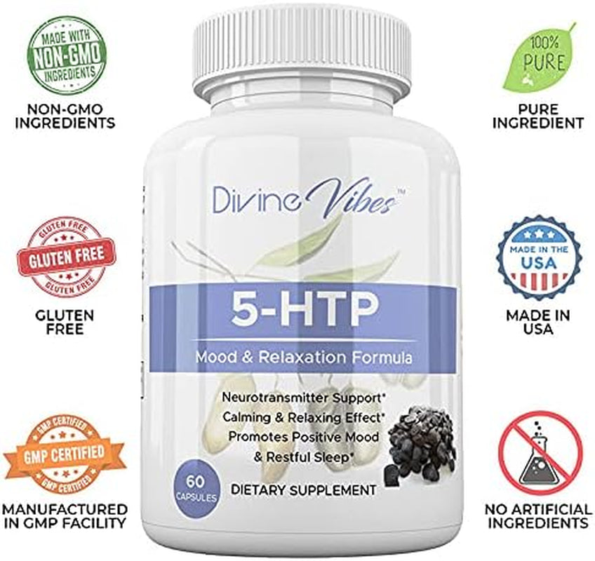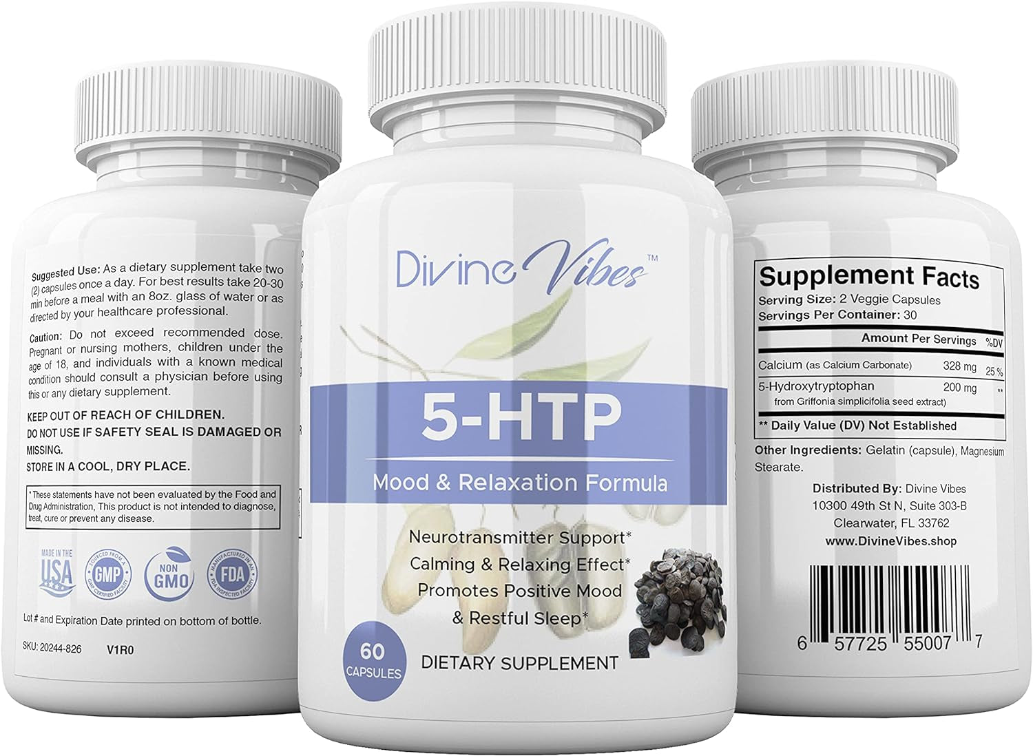 5-HTP 200Mg plus Calcium for Mood, Sleep, Stress Support - Boosts Serotonin Production - High Purity – 60 Capsules