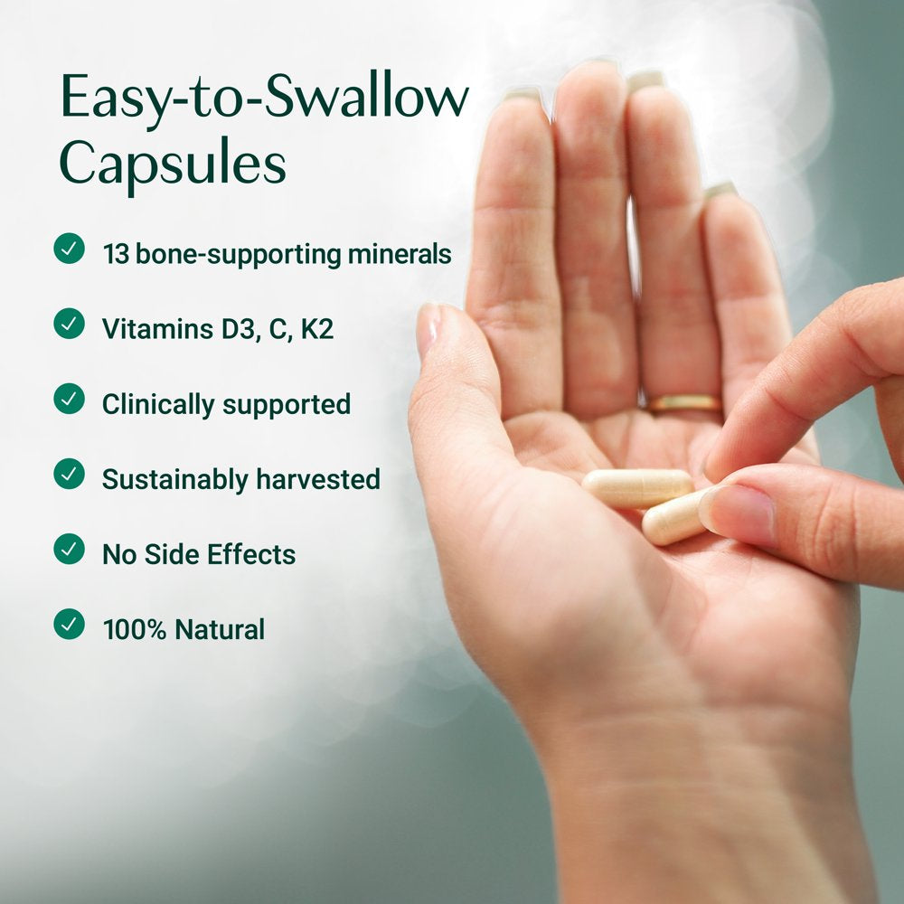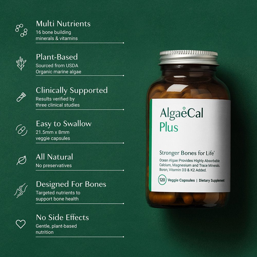 AlgaeCal Plus is a clinically approved, complete, multi-nutrient approach to bone building, containing all 13 essential bone-supporting minerals, plus added clinical doses of Vitamin D3, Vitamin K2, calcium, boron, and magnesium. It's a wild-harvested, plant-based supplement, derived from a South American marine red algae called, sun-dried, and milled into an organic powder, without extraction or additives, just pure whole food. Proven by multiple studies to support bone health for both men and women.