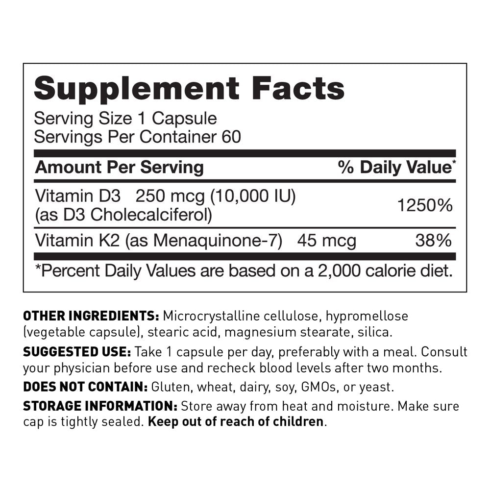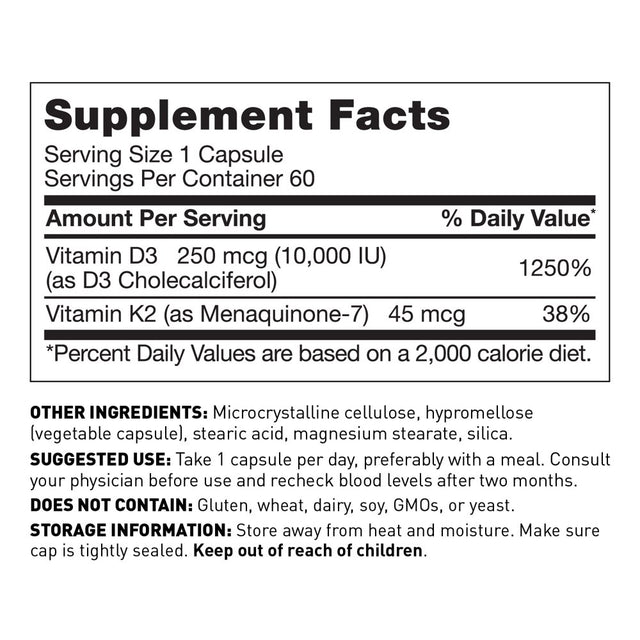 Encapsulated Vitamin D3 and K2 are both essential for maintaining bone and cardiovascular health, as well as immune and neurological function. VITAMIN D3/K2 10,000IU CAPSULES: Support strong, healthy, and flexible bones Offer 10,000iu of super bioavailable Vitamin D3 per capsule Has 45mcg of Vitamin K2 as MK7 per capsule Are easy to take - once per day, with a meal Discourage calcium buildup in arteries and soft tissue Vitamin D is needed at every level for whole body health. In fact, every single type of tissue in your body has receptors for Vitamin D. Your bones, heart, brain, muscles, immune system, you name it, all require sufficient Vitamin D to function optimally.