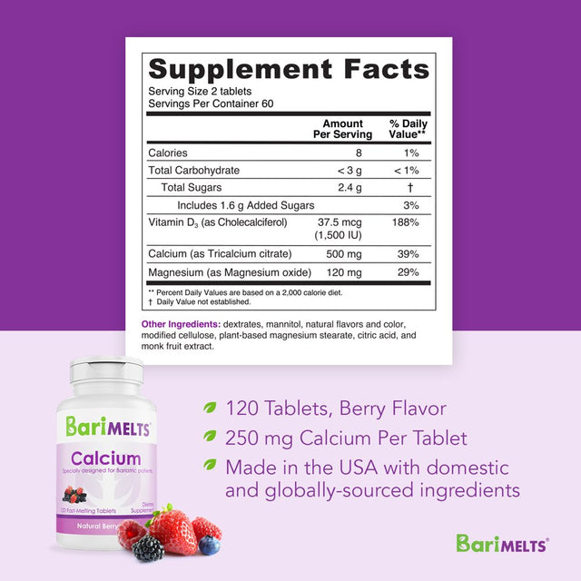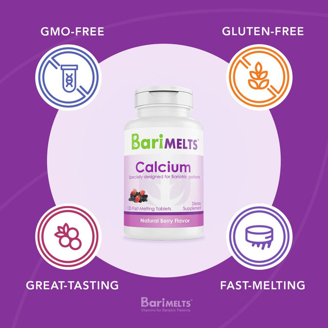 Barimelts Bariatric Calcium Citrate with Vitamin D3 and Magnesium for Bone Health Support, 120 Smooth-Dissolving Tablets, Post Weight Loss Surgery Patients, Berry Flavored Dietary Supplements