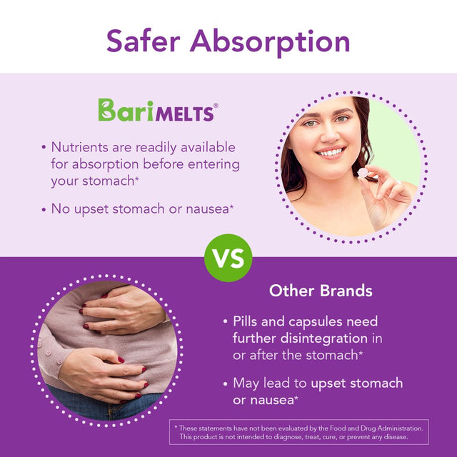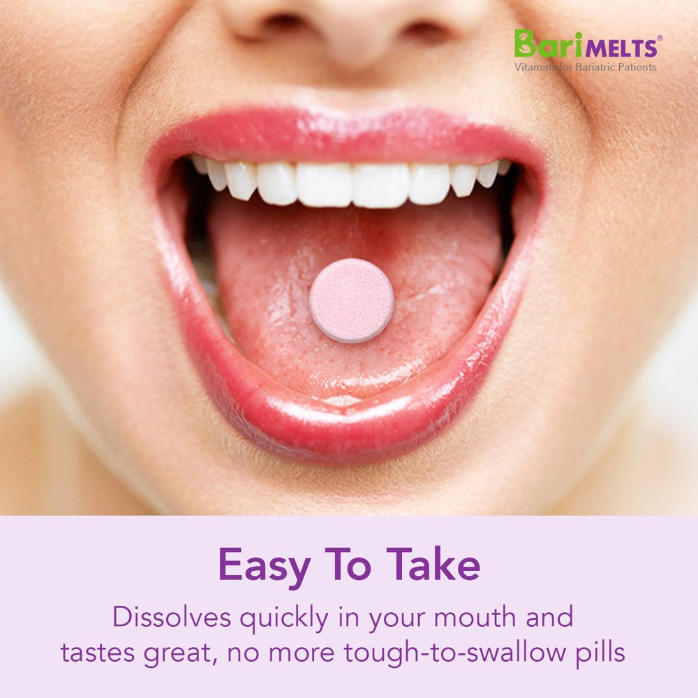 The BariMelts® delivery system is great for patients who have undergone bariatric surgery as it dissolves in the mouth and makes the vitamins available for absorption before they reach the stomach. Since the vitamins dissolve in the mouth, the tablet does not take up space in the stomach and allows you to eat a true meal. Some patients post-surgery may have difficulty swallowing and therefore this dosage form would help with that as well. BariMelts® Calcium uses calcium citrate instead of calcium carbonate because studies have shown that the citrate form has superior bioavailability than the carbonate form for bariatric surgery patients. Most calcium supplements contain vitamin D3 but BariMelts® Calcium also includes magnesium. The addition of this essential element serves to increase the absorption and metabolism of both calcium and vitamin D so that the body can use both of these vitamins more efficiently.