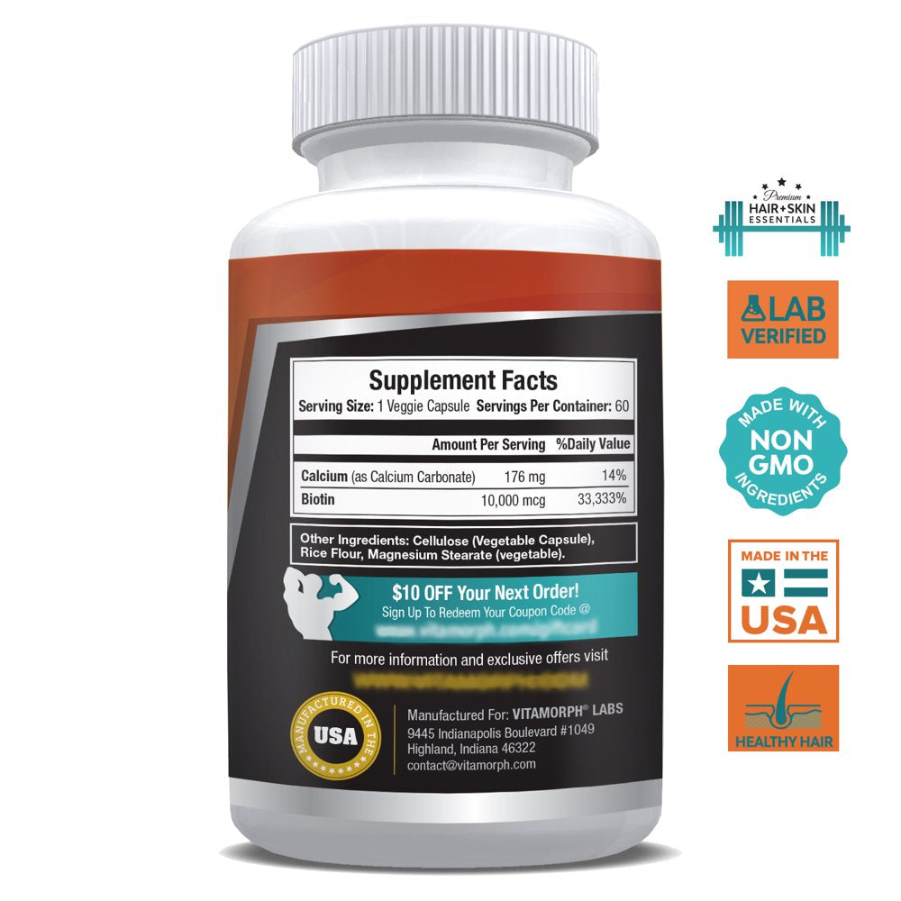 Biotin 10000 Mcg + Calcium - Maximum Strength Biotin Capsule Vitamin Supplement - Best Vitamin B7 Biotin for Men & Women with Calcium to Support Hair, Skin, Nails by Vitamorph Labs - 60 Veggie Caps