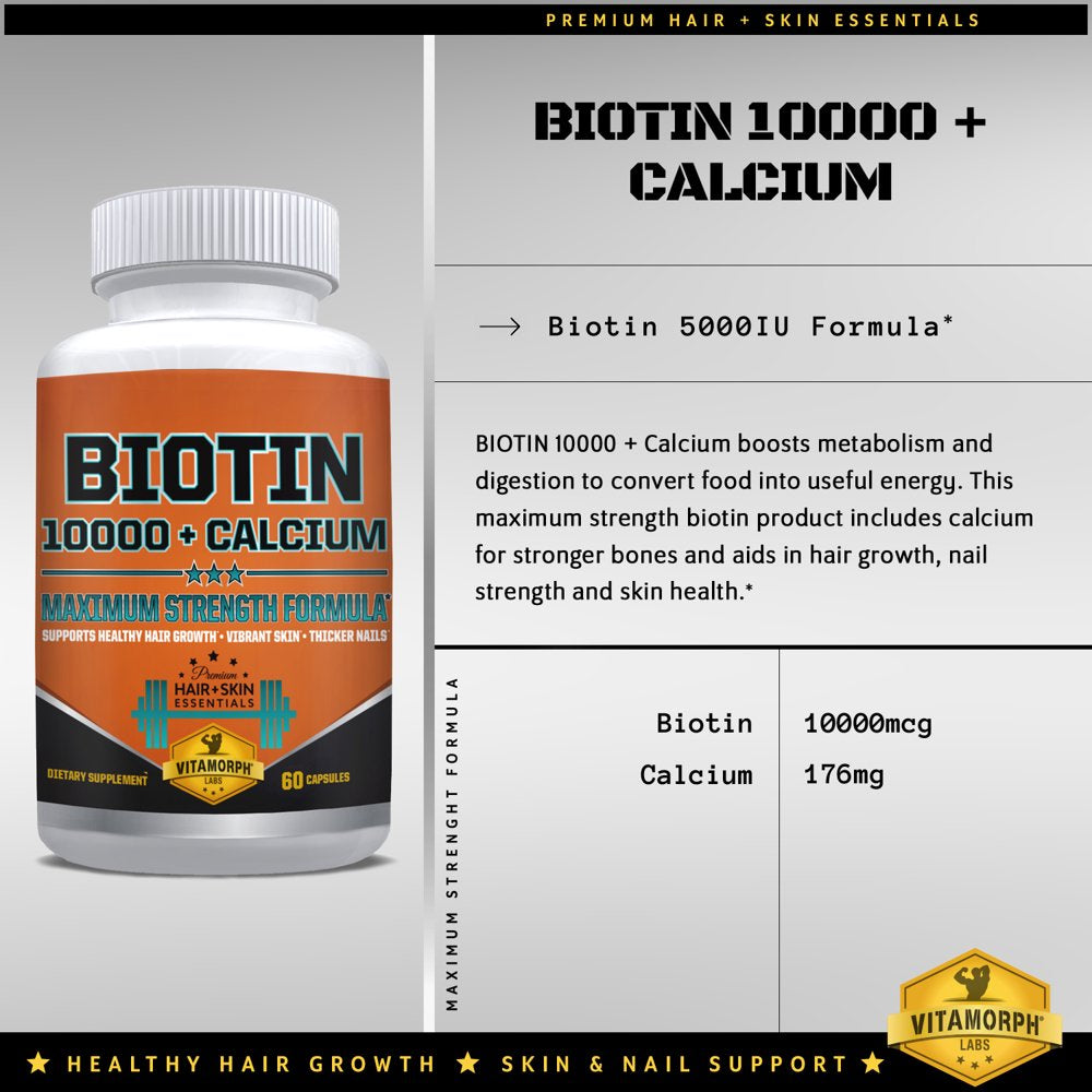 - BIOTIN + CALCIUM COMBO – Biotin 10000 + Calcium by Vitamorph Labs offers the best in biotin otherwise known as vitamin B7 or vitamin H. This premium formula includes added calcium for added cellular and bone strength. Get the most out of your biotin with this premium biotin + calcium combo!