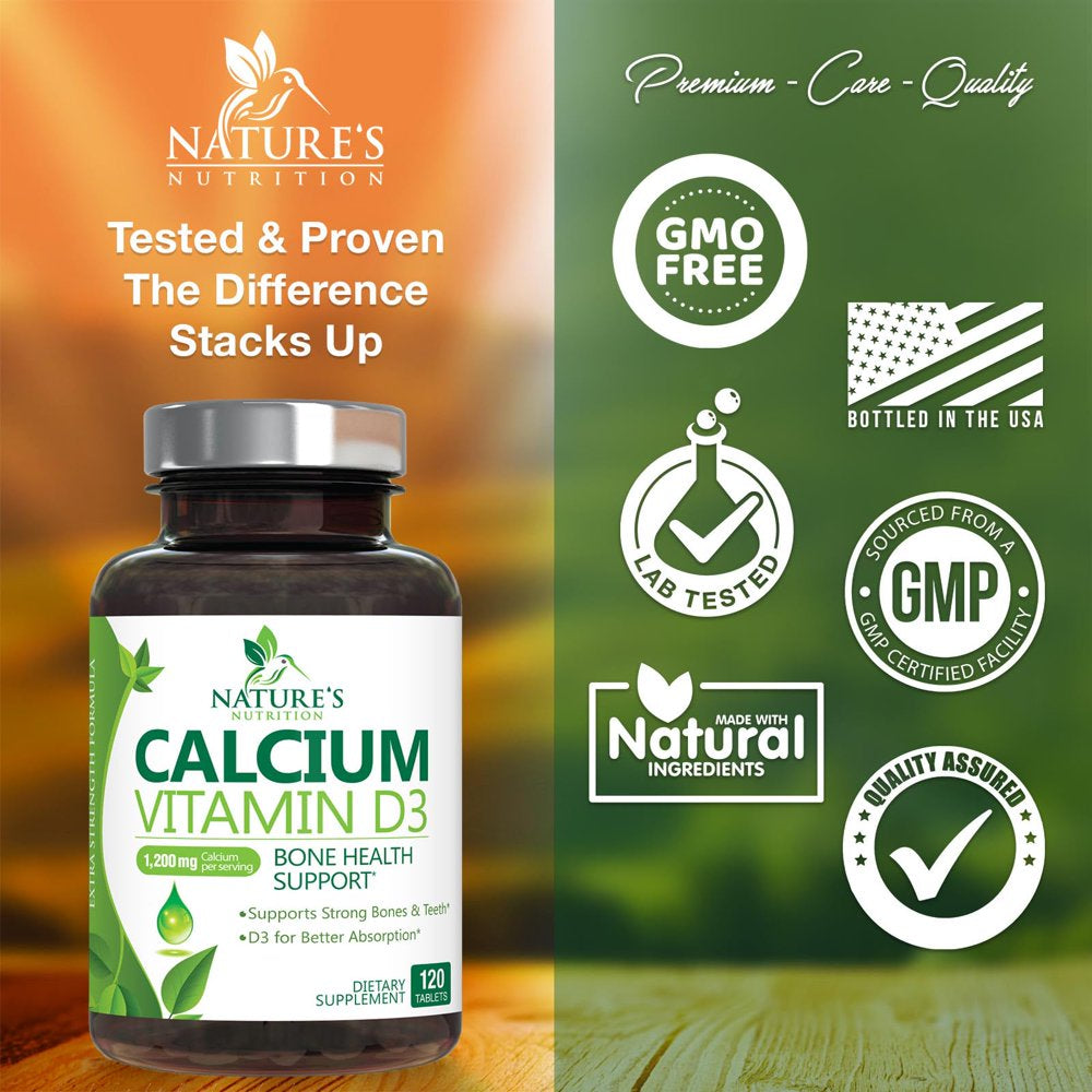 Calcium 1200 Mg plus Vitamin D3, Bone Health & Immune Support - Nature'S Calcium Supplement with Extra Strength Vitamin D for Extra Strength Carbonate Absorption Dietary Supplement - 120 Tablets