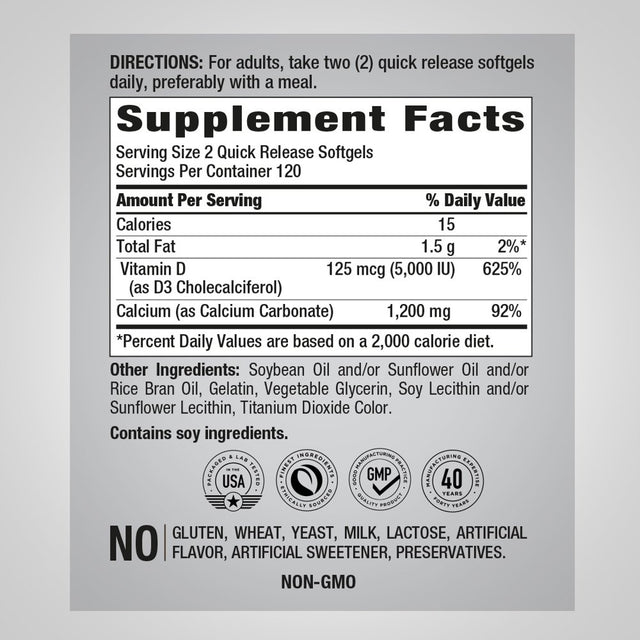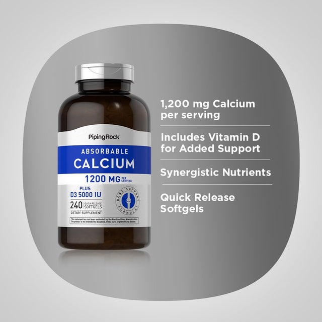 PipingRock® Absorbable Calcium 1200 mg + D3 5000 IU is a trusted source of these key nutrients. Our advanced formula unites superior quality calcium with vitamin D3 in quick-release, easy-to-swallow softgels at an exceptional value!