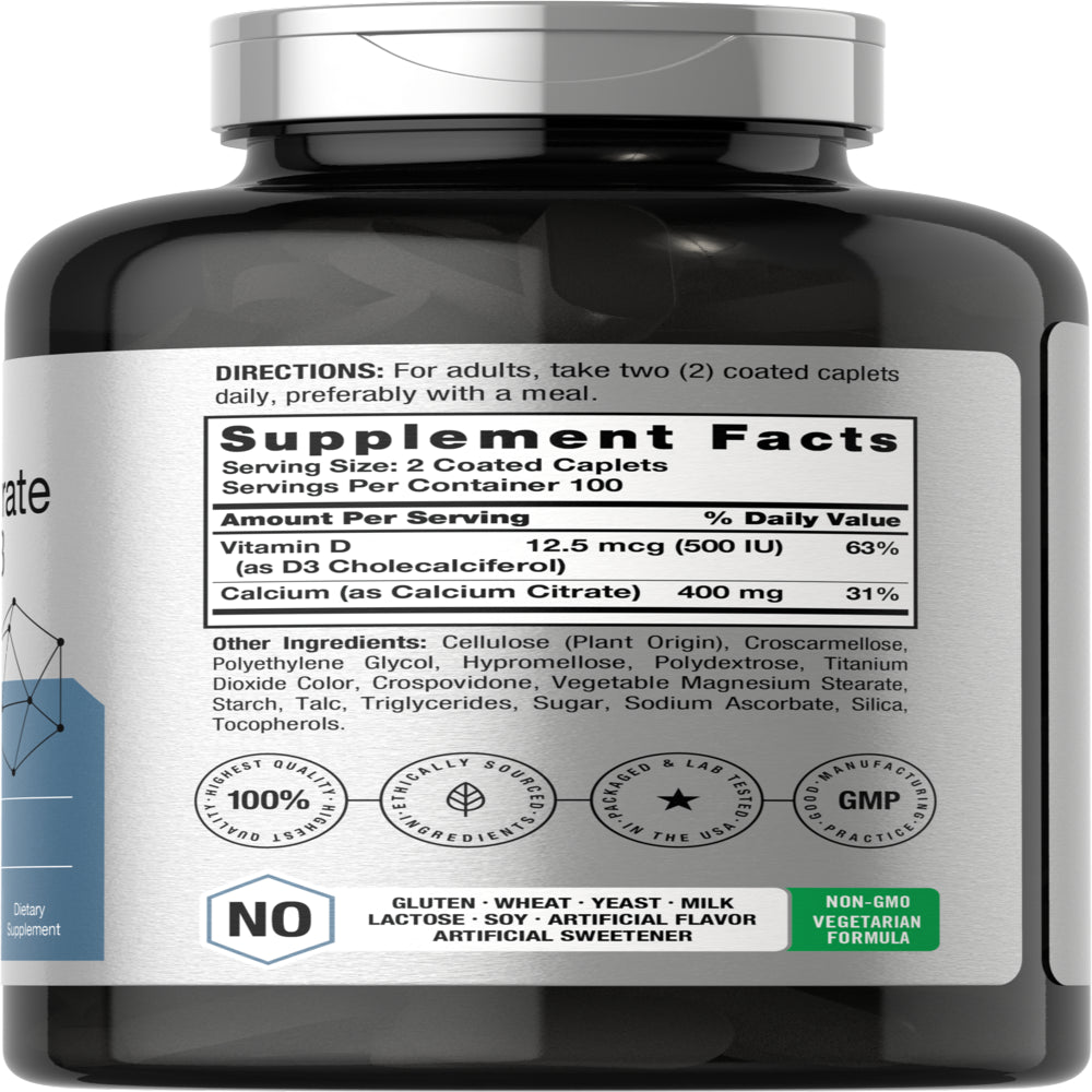 This scientific supplement provides 400 mg per serving of Calcium Citrate plus Vitamin D3, a complementary duo of nutrients in convenient coated caplets. Our vegetarian formula is gluten-free, non-GMO, and preservative free, making this formula the best support supplement for men and women everywhere.